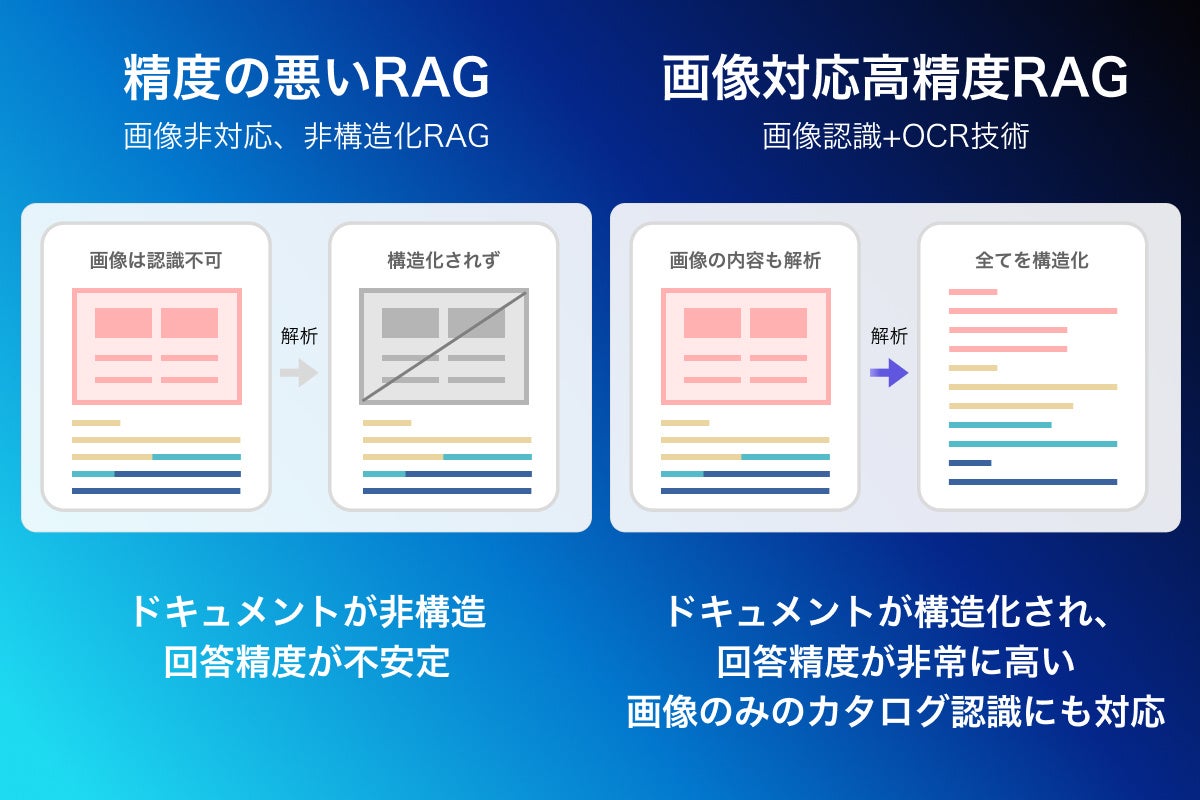 画像解析精度の向上によって、画像の多い資料や文字列の配置が複雑な文書もより正確に読み取ることが可能となりました。紙媒体をスキャンしたデータなども正確に読み取ってRAGのリソースとして活用できるため、カタログやマニュアルなどの資料の共有・検索の効率化に貢献します。