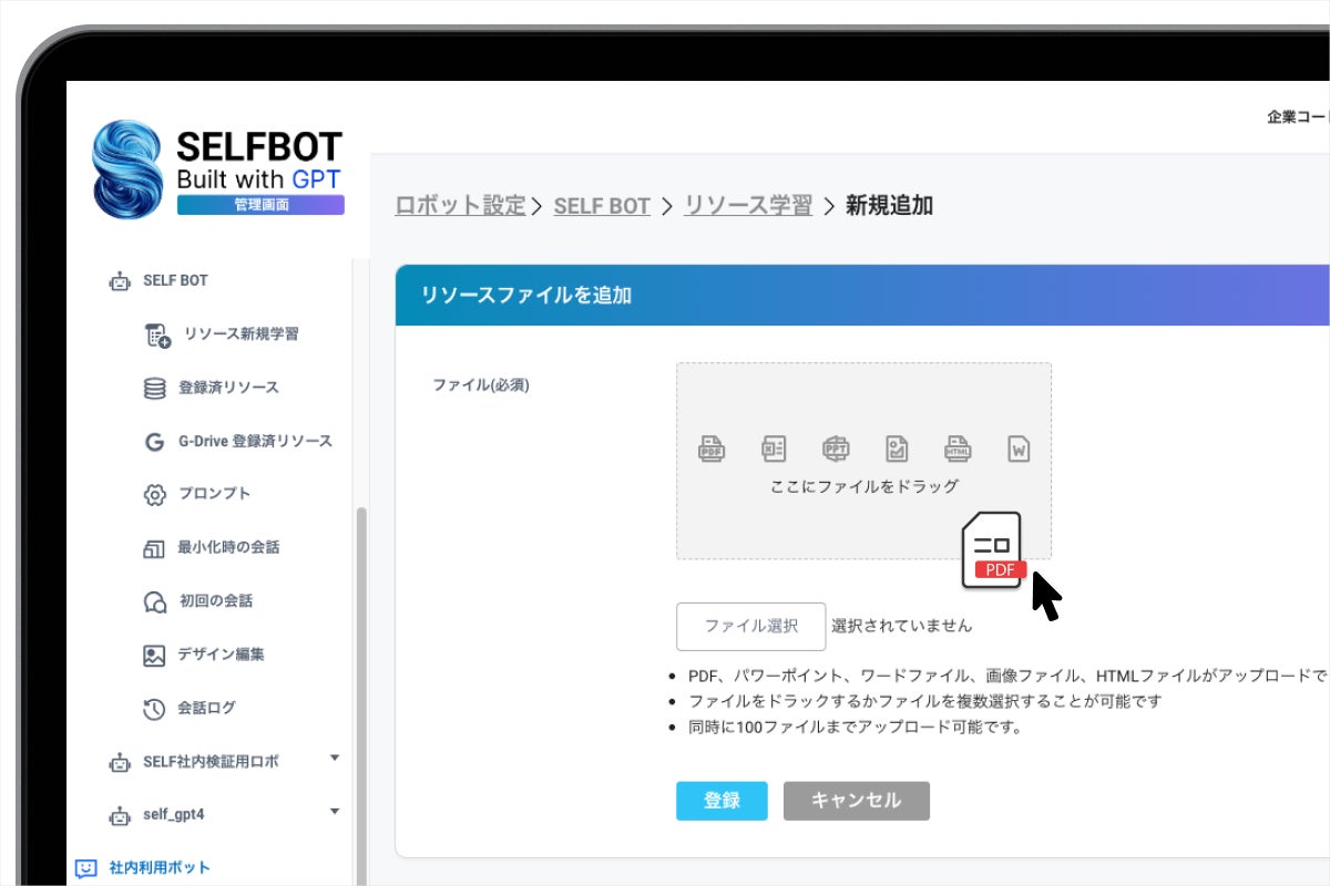 既存のドキュメントファイル(Word、Excel、PDFなど)や、WebページのURLをアップロードするだけで、社内データと連携したAIチャットボットを構築。従来のチャットボットと比べ、圧倒的にスピーディな導入が可能です。