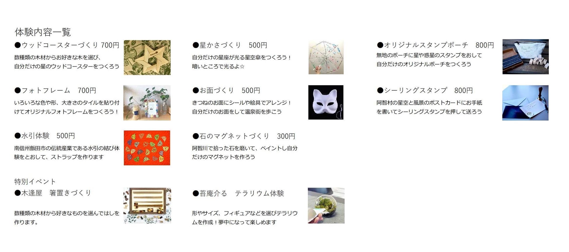 体験や山の自然素材を使ったクラフト体験、阿智村の自然に感じるアウドドア体験など、阿智村の豊かな自然と