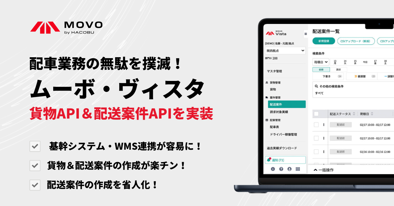 配送案件管理サービス「MOVO Vista」、貨物API・配送案件APIを実装し外部システムとの連携が容易に