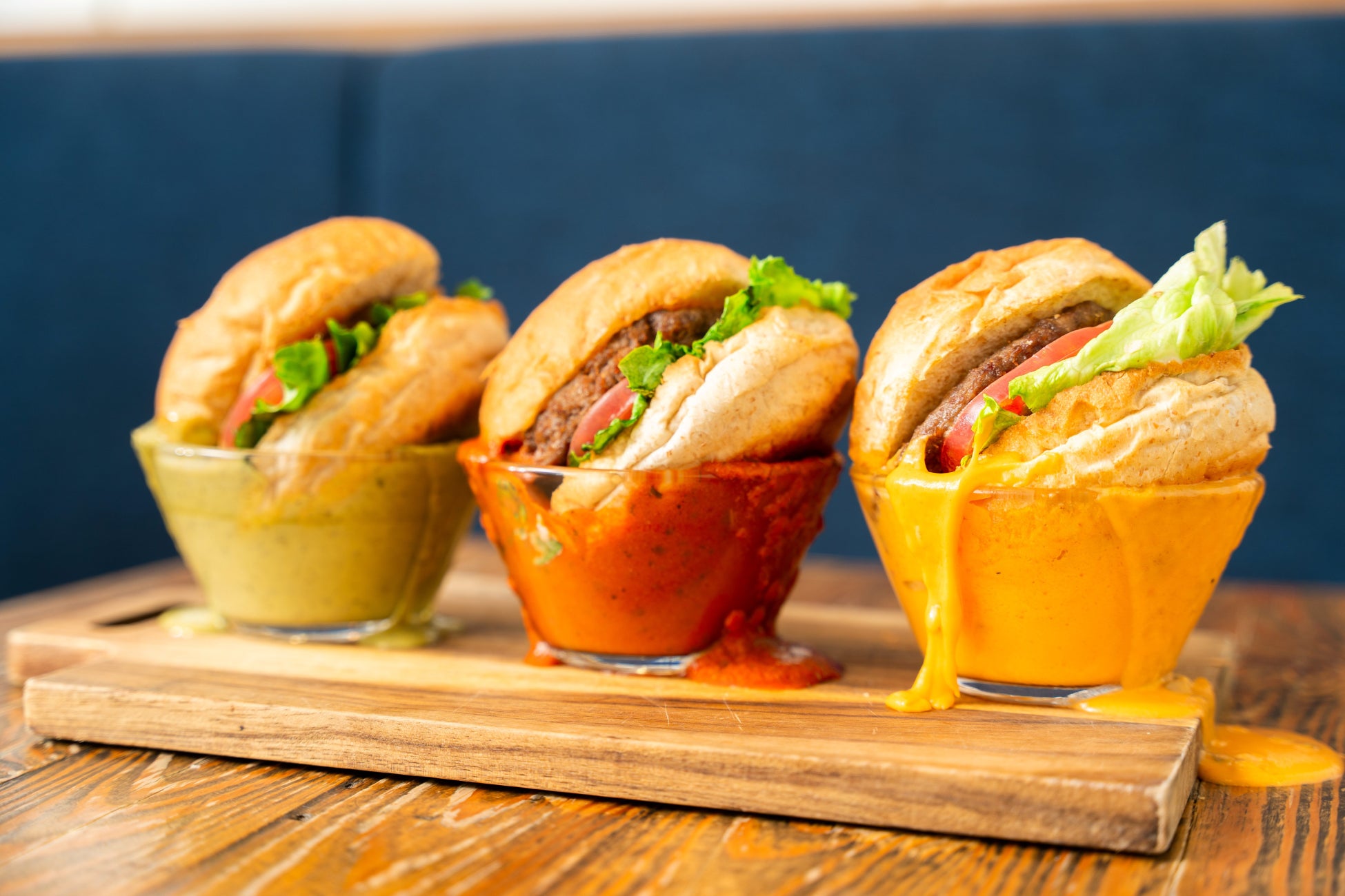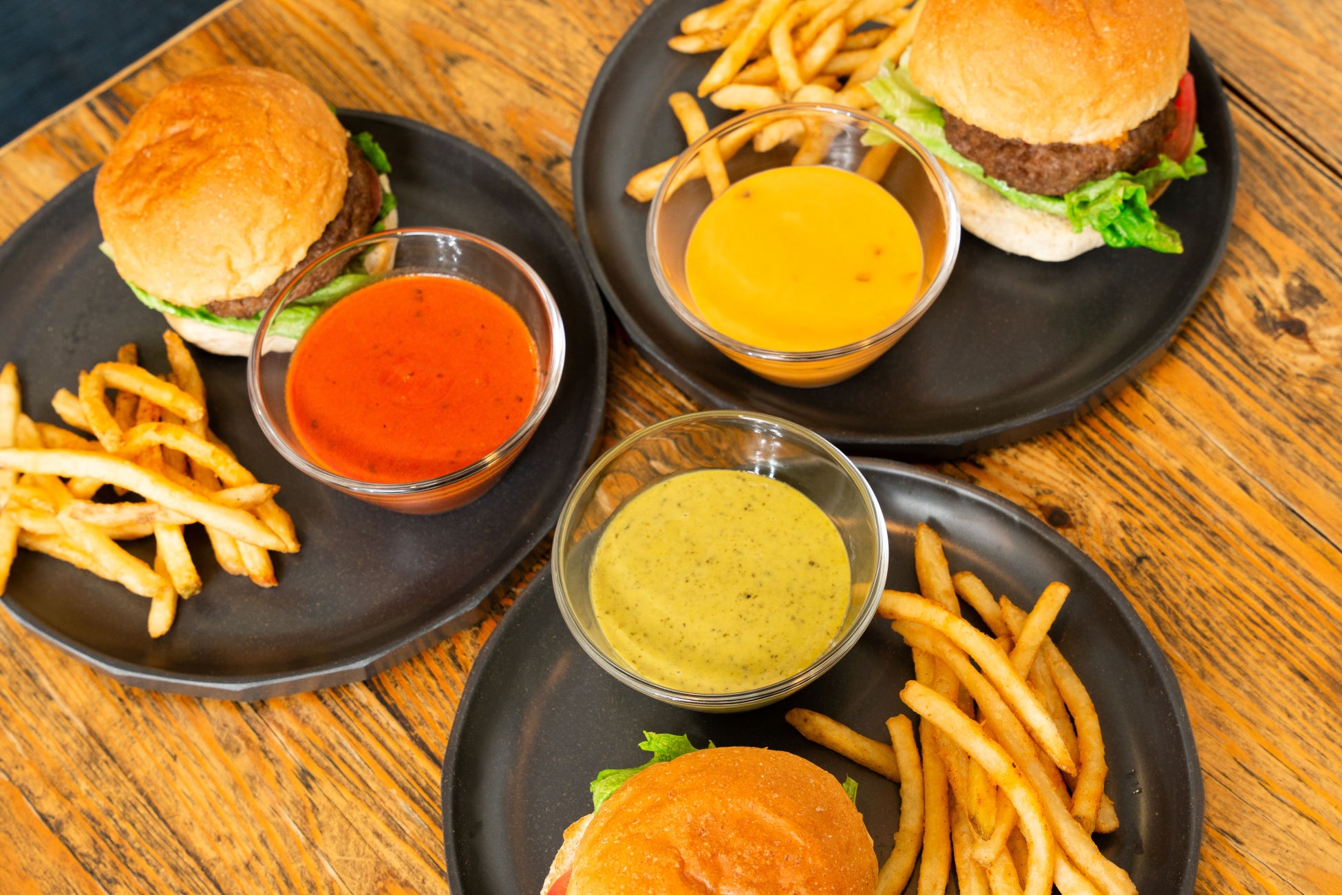 それぞれ異なる3種のディップソースは『最後まで飽きずに食べきれるか』『サイドメニューとの相性はどうか』など、何度も試作を重ねました。そしてソースを楽しむためにハンバーガーの具材はパティ・トマト・レタスと最低限に。全く違う3種類ですが、ハンバーガーはもちろん、ポテトやオニオンリングなどのサイドメニューとの相性も抜群です。独り占めするもよし、複数人でシェアして他のディップソースを楽しむもよし!心ゆくまでお楽しみください。