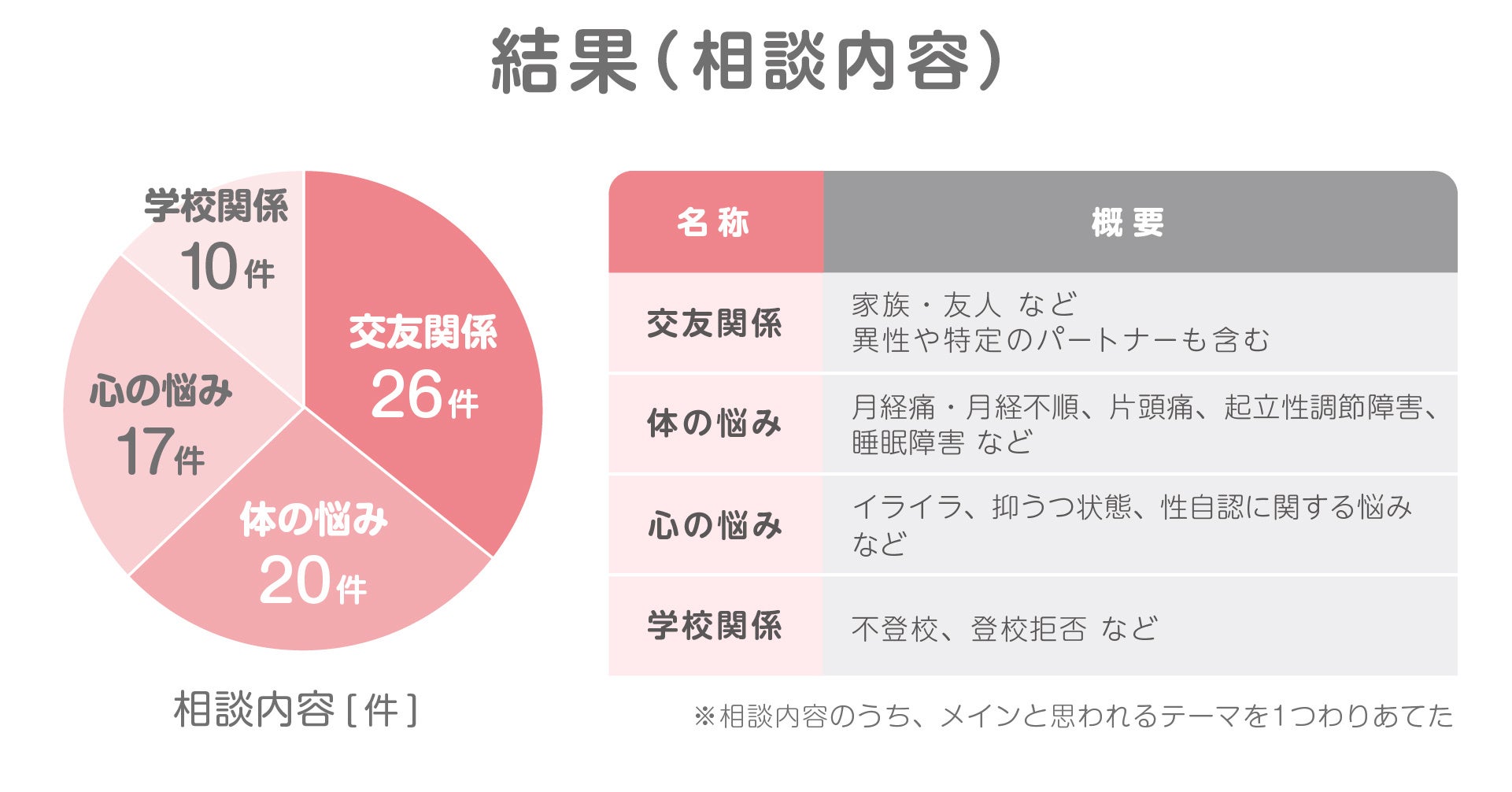 ・相談内容は多岐にわたっており、医療機関では扱わない「交友関係」に関する相談が最多であった。