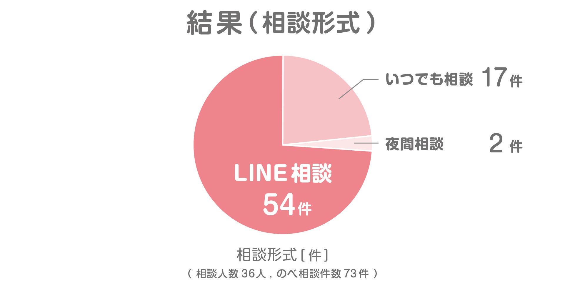 ・利用された相談形式は、LINE相談が最多でした。予約や会員登録が不要、メッセージの回数制限・時間制限がないという利用しやすさがあったと思われる。