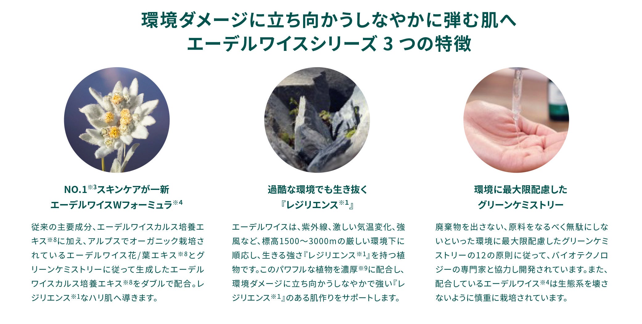 自然界の過酷な環境下に順応し、生きる強さ「レジリエンス※1」を持つ植物「エーデルワイス」のように、「若さ」に固執するのではなく年を重ねるごとに「しなやかな強さ(レジリエンス※1)」を携え、困難な状況にも負けず自分らしく前を向いてほしいというブランドの想いを反映したシリーズです。植物のパワーと、人や環境への負荷を最少限に抑える技術「グリーンケミストリー」を融合し、肌の土台※2からふっくらハリとうるおいある肌に導きながら、製品製造においても配慮されたブランド人気No.1※3 の画期的なスキンケアラインです。