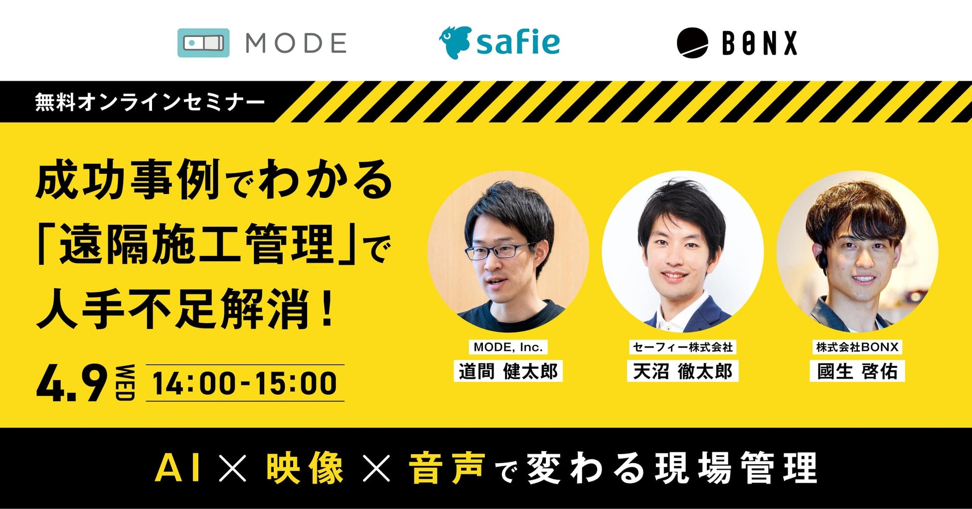 株式会社BONX(本社:東京都中央区、代表取締役:宮坂貴大、以下、BONX)は、IoT技術に生成AIをかけ合わせることで、あらゆる作業現場での働き方に革新を起こすMODE, Inc.(本社:米国カリフォルニア州サンマテオ、CEO:上田 学、以下、MODE)、クラウド録画サービスシェアNo.1(※)のセーフィー株式会社(東京都品川区:代表取締役社長CEO 佐渡島 隆平、以下、セーフィー)と2025年4月9日(水)に共催セミナーを実施することをお知らせいたします。