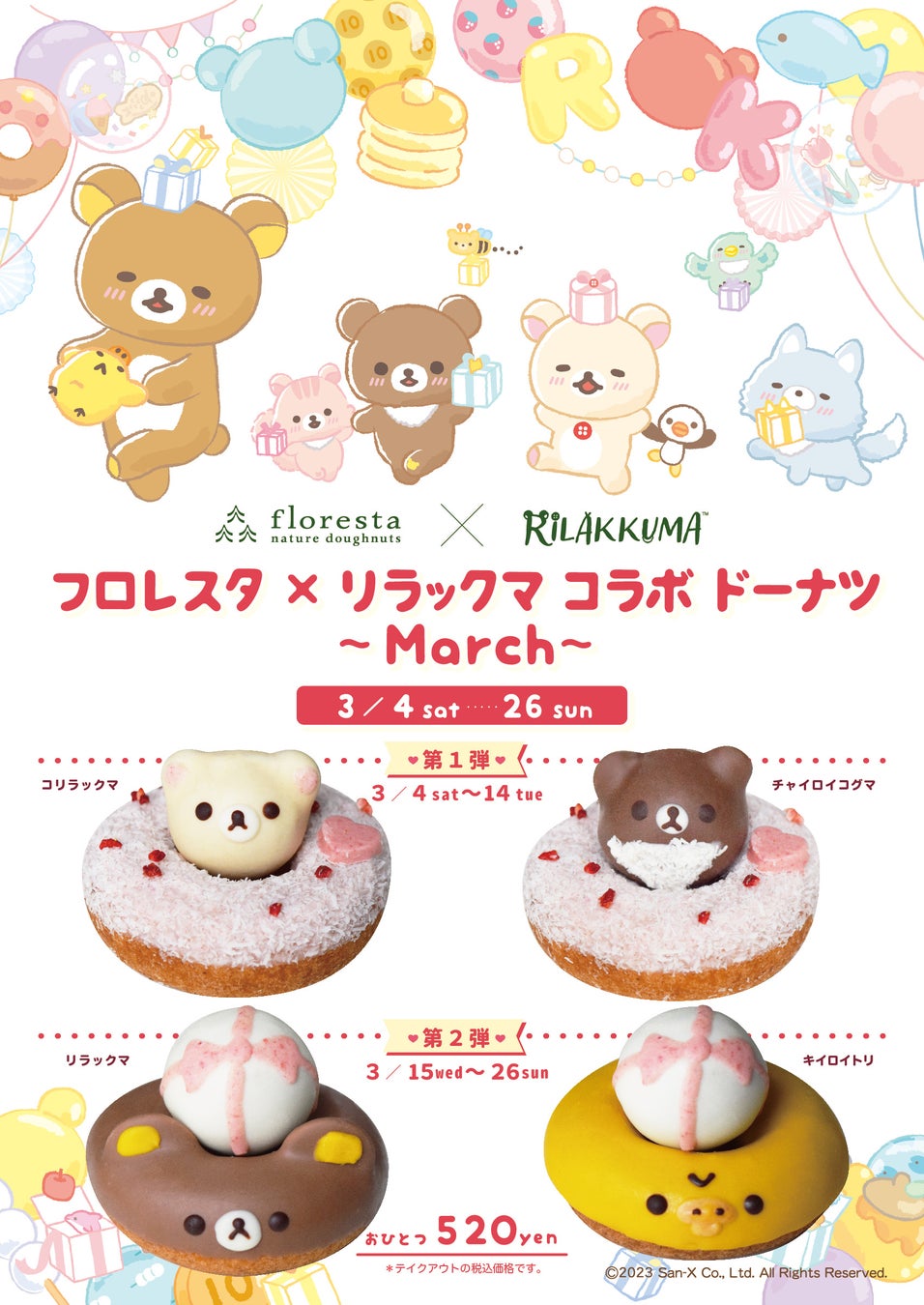株式会社フロレスタ(本社:大阪市浪速区/代表取締役社長:辻尾吉厚)は、2023年3月4日(土)から26日(日)の期間限定で店頭及びオンラインストアにて「リラックマコラボドーナツ 〜March〜」を販売します。