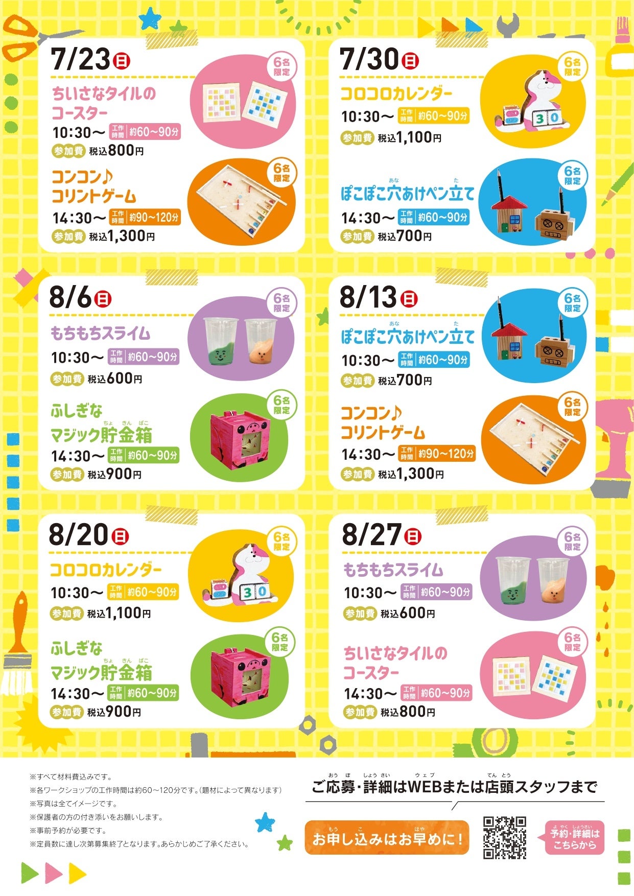 ※1 タイルコースター・コリントゲーム・カレンダー・ペン立て・もちもちスライム・貯金箱を作るワークショップ