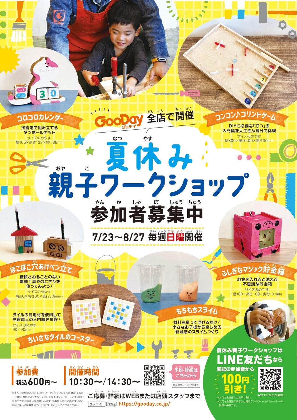 夏休み親子ワークショップは、6種のワークショップ(※1)をグッデイ全62店舗にて、7月23日(日)~8月27(日)の毎週日曜日午前・午後1日2回開催全12回×63店舗分 計756回実施しました。