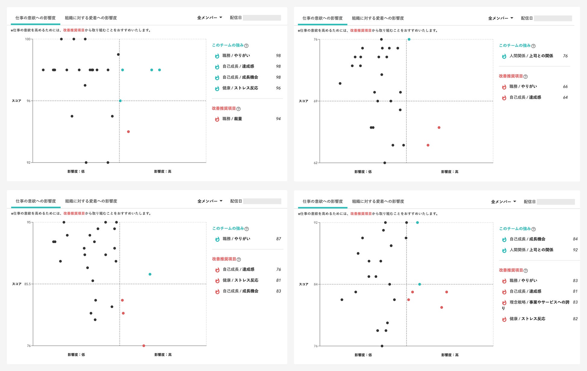 本技術は、組織づくりの現場で、日々チームと向き合うマネージャー・管理職のみなさまの負担軽減に大きく貢献すると信じています。これまでは感覚や勘に頼ることが多かったチームづくりですが、影響度を把握することで優先度を決める手助けとなれるよう分析機能も追加し多角的にチームの状況を把握できるようになっています。