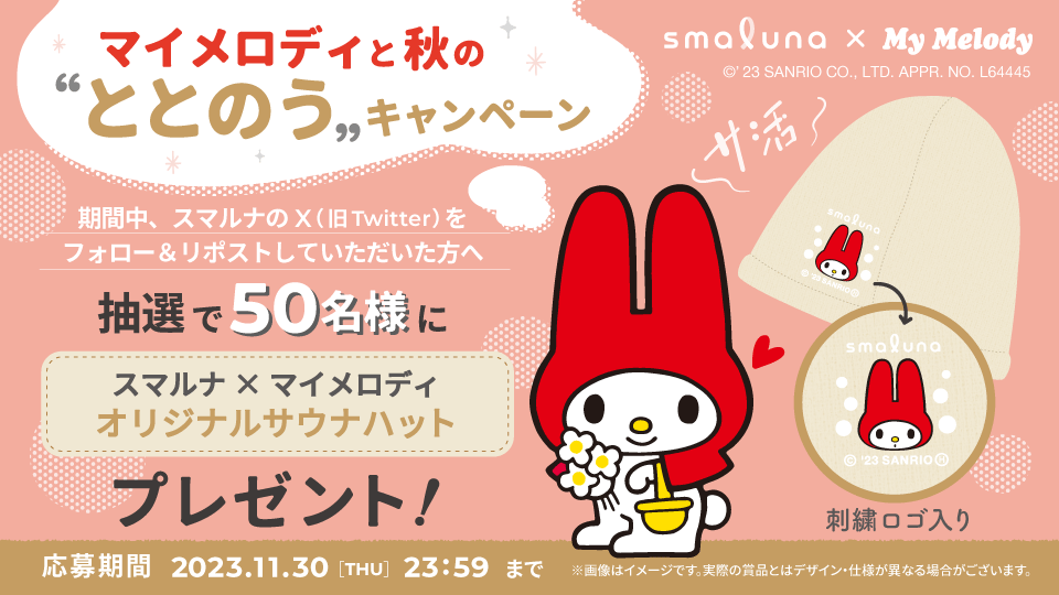スマルナ公式Xをフォロー&キャンペーン投稿をリポストいただいた方の中から抽選で50名様にマイメロディのサウナハットをプレゼント