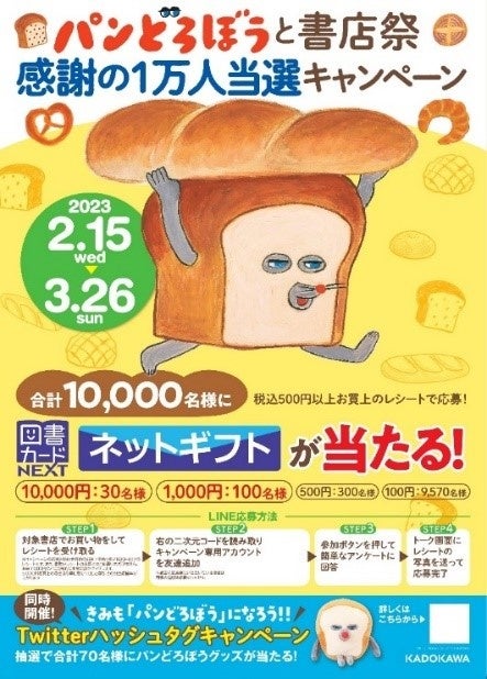 「パンどろぼう」シリーズ(柴田ケイコ/KADOKAWA)は、お茶目で憎めないパンどろぼうが登場し、読み聞かせが楽しいユーモア絵本として人気を集めています。今回はシリーズへのご愛顧、ならびに普段から書店をご利用いただいているお客様への感謝の気持ちを込めて、合計10,000名様に図書カードネットギフトが当たる当選者数が過去最大規模のキャンペーンを実施いたします。