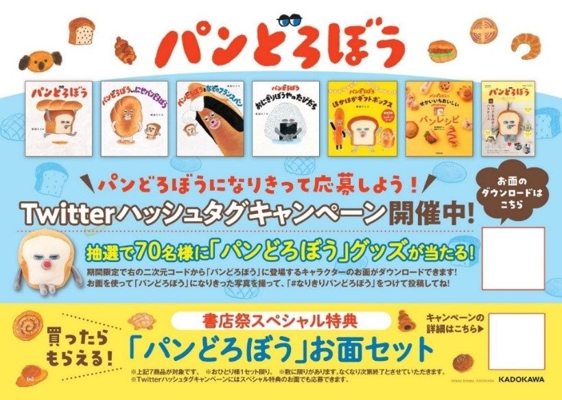 また、実施書店では「パンどろぼう」シリーズの店頭フェアを開催します。店頭で対象作品をご購入いただいた方には、限定特典として「パンどろぼう」のお面セットをプレゼントし、限定特典のお面もしくは店頭パネルからダウンロードできるお面を使ってTwitterで応募できる「なりきり「パンどろぼう」キャンペーン」も同時開催します。お客様に楽しみながら「パンどろぼう」の魅力に触れていただける企画をご用意し、店頭を盛り上げてまいります。