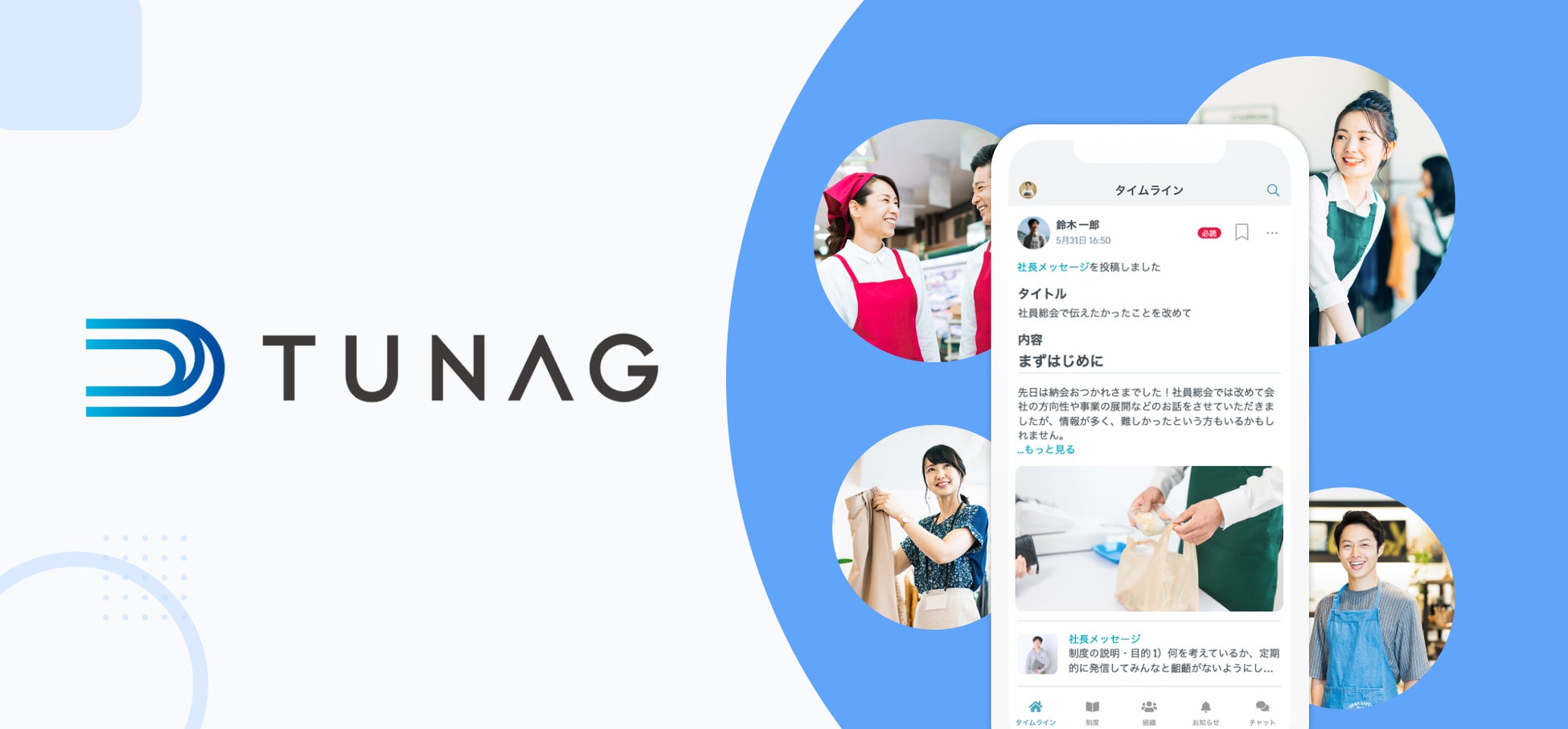 TUNAG(ツナグ)は、パート・アルバイトも含め、従業員の定着率向上や情報共有の促進、業務DXで、安定した組織運営を実現する社内アプリです。