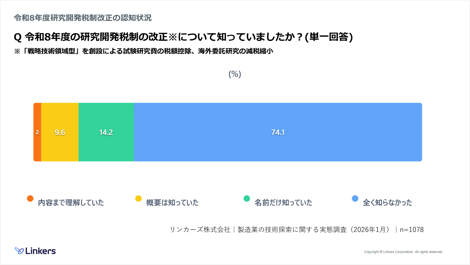 また、令和8年度(2026年度)に予定されている研究開発税制改正についても、74.1%が「全く知らなかった」と回答しており、政策環境の変化と現場の認識との間にギャップがある実態も明らかになっています。