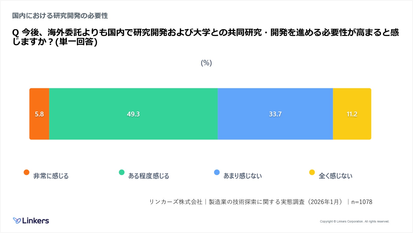 今後、海外委託よりも国内で研究開発および大学との共同研究・開発を進める必要性について尋ねたところ、「非常に感じる」5.8%、「ある程度感じる」49.3%と、合計55.1%が必要性を感じていると回答した。一方で、「あまり感じない」(33.7%)、「全く感じない」(11.2%)は計44.9%となった。
