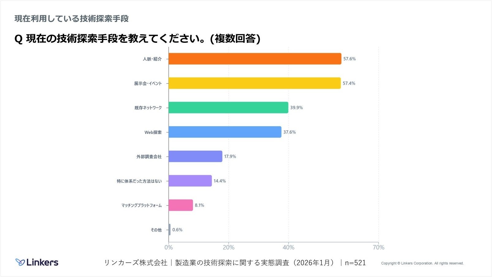 技術探索は「人脈・紹介」57.6%、「展示会・イベント」57.4%が主流