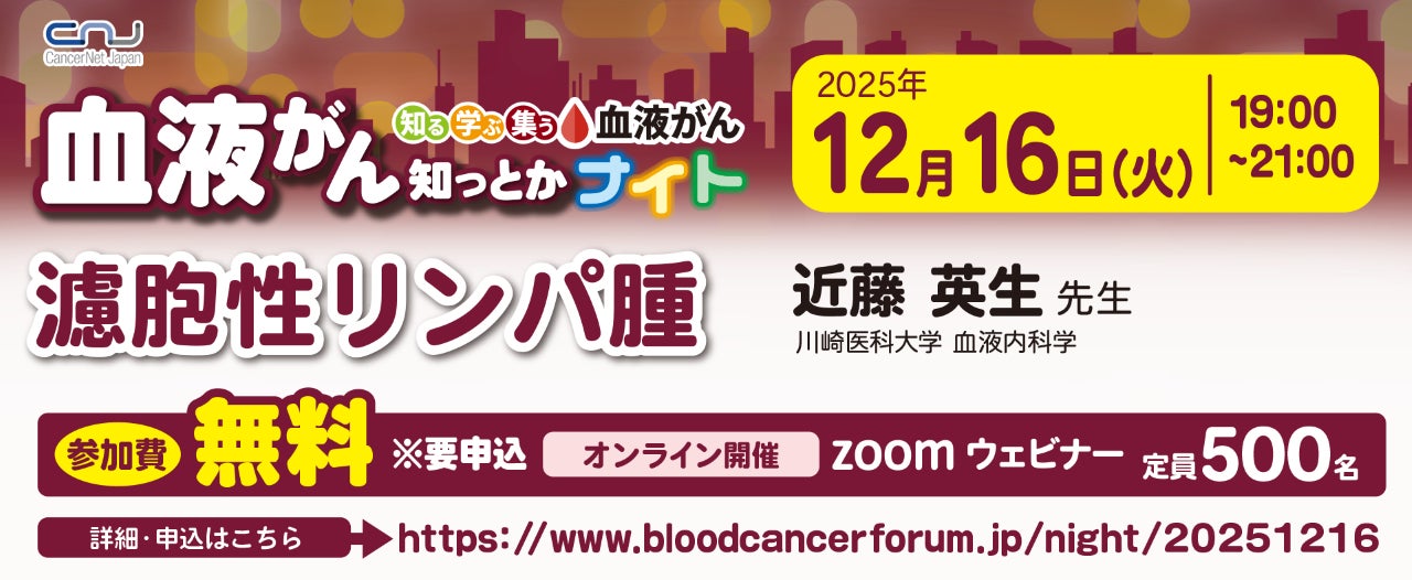 認定NPO法人キャンサーネットジャパン(東京都文京区 理事長 岩瀬 哲)は、血液がんに関するオンラインセミナー「血液がん知っとかナイト」を開催しており、22回目の開催となる2025年12月は「濾胞性リンパ腫」をテーマに開催する運びとなりました。