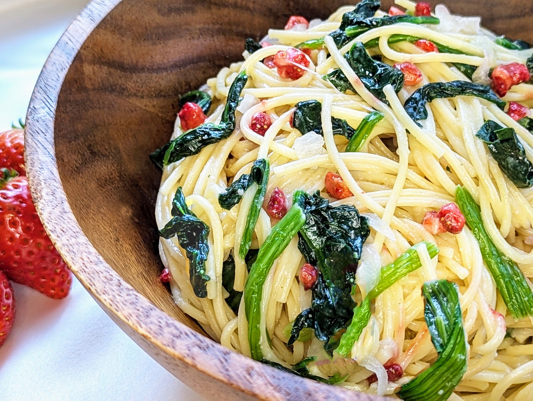 甘酸っぱいフリーズドライのいちごがアクセントの、ユニークなパスタサラダです。カッテージチーズとオリーブオイルでコクを加え、マヨネースベースのソースにもいちごピューレを合わせました。ほどよくフルーティーな味わいと、甘みを増した旬のほうれん草と一緒にお楽しみください。