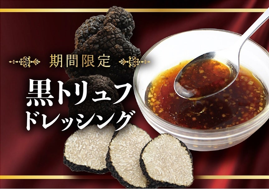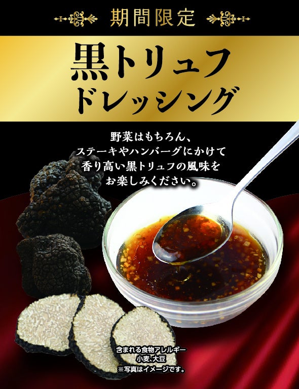 また限定ドレッシングには、導入の度に人気の、香り高い黒トリュフの贅沢な風味が楽しめる「黒トリュフドレッシング」が登場します。店内でカットした新鮮な野菜だけではなく、ステーキやハンバーグにかけてお楽しみください。