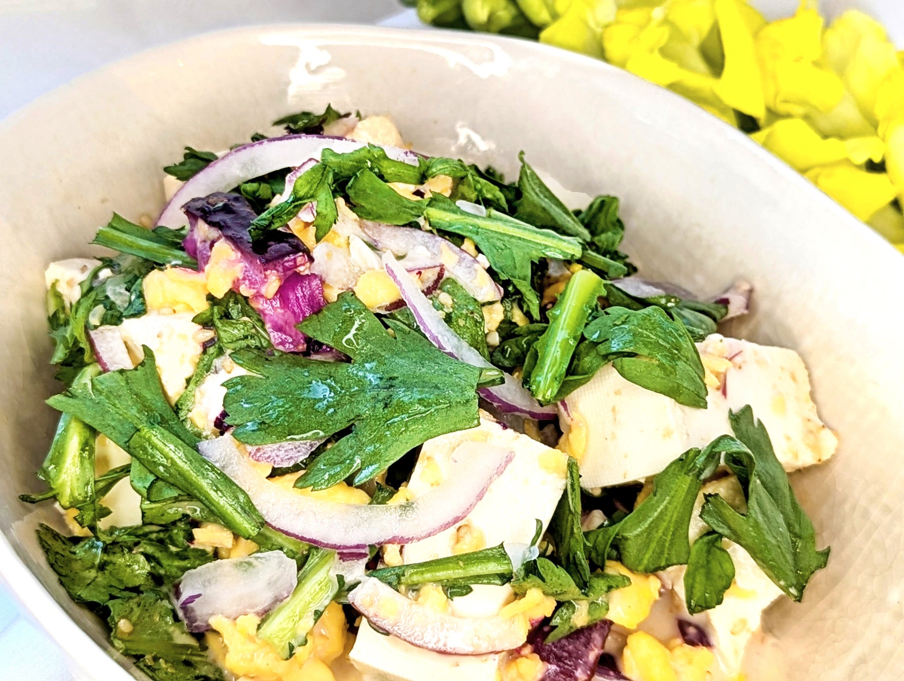 菊菜のほろ苦さが、クリーミーで風味のあるごまドレッシングとマッチし、スクランブルエッグの甘さ、しば漬けの酸味が調和する豆富のサラダです。野菜とタンパク質が一度に摂れるため、カラダにも嬉しい一品です。