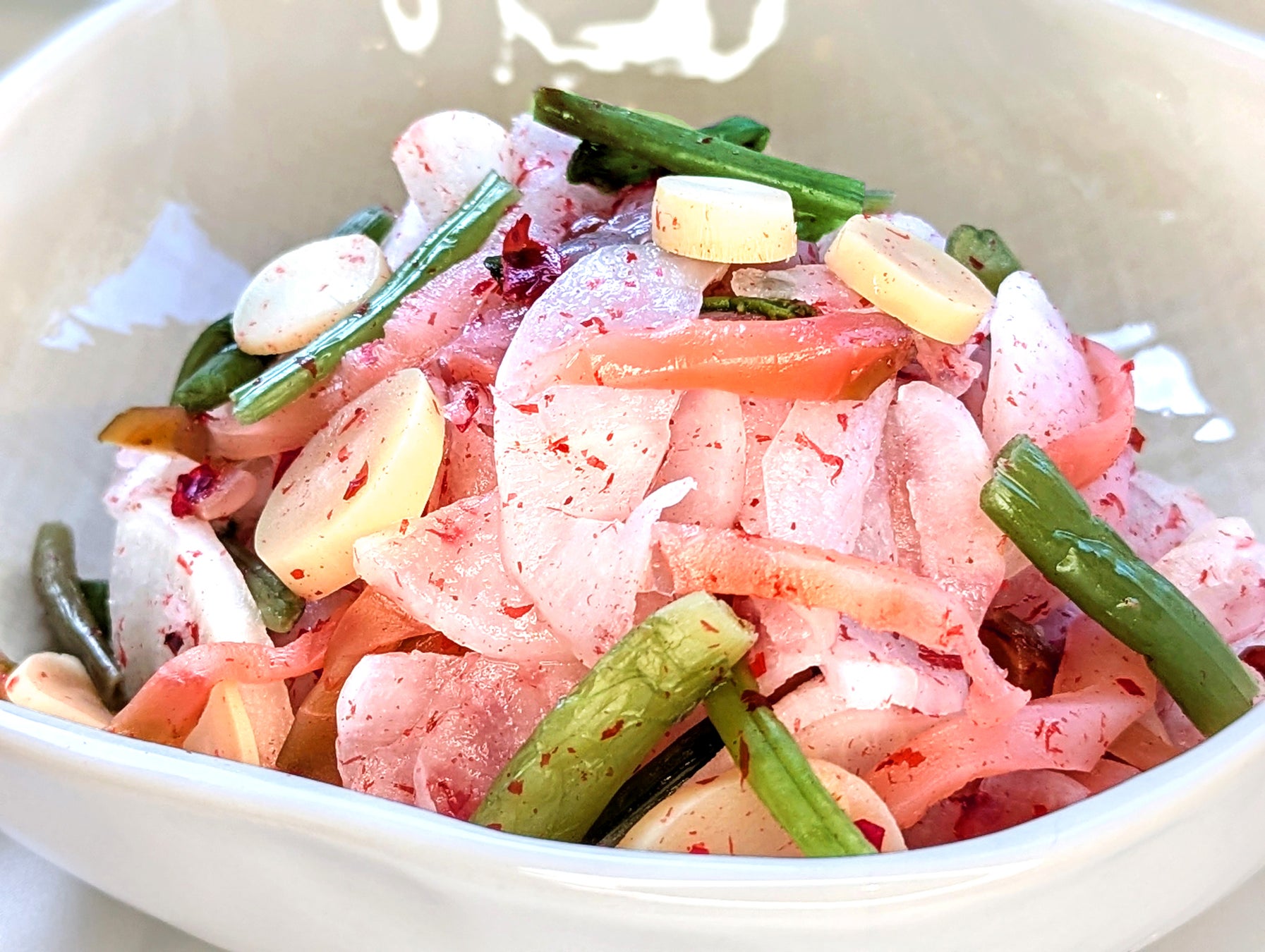 春の訪れを感じさせるような、梅の風味が華やかなさっぱりとした大根のサラダです。寒さによりみずみずしさと甘さが増した大根と、春らしいわらびなどの山菜、食感のよいザーサイがよく合います。