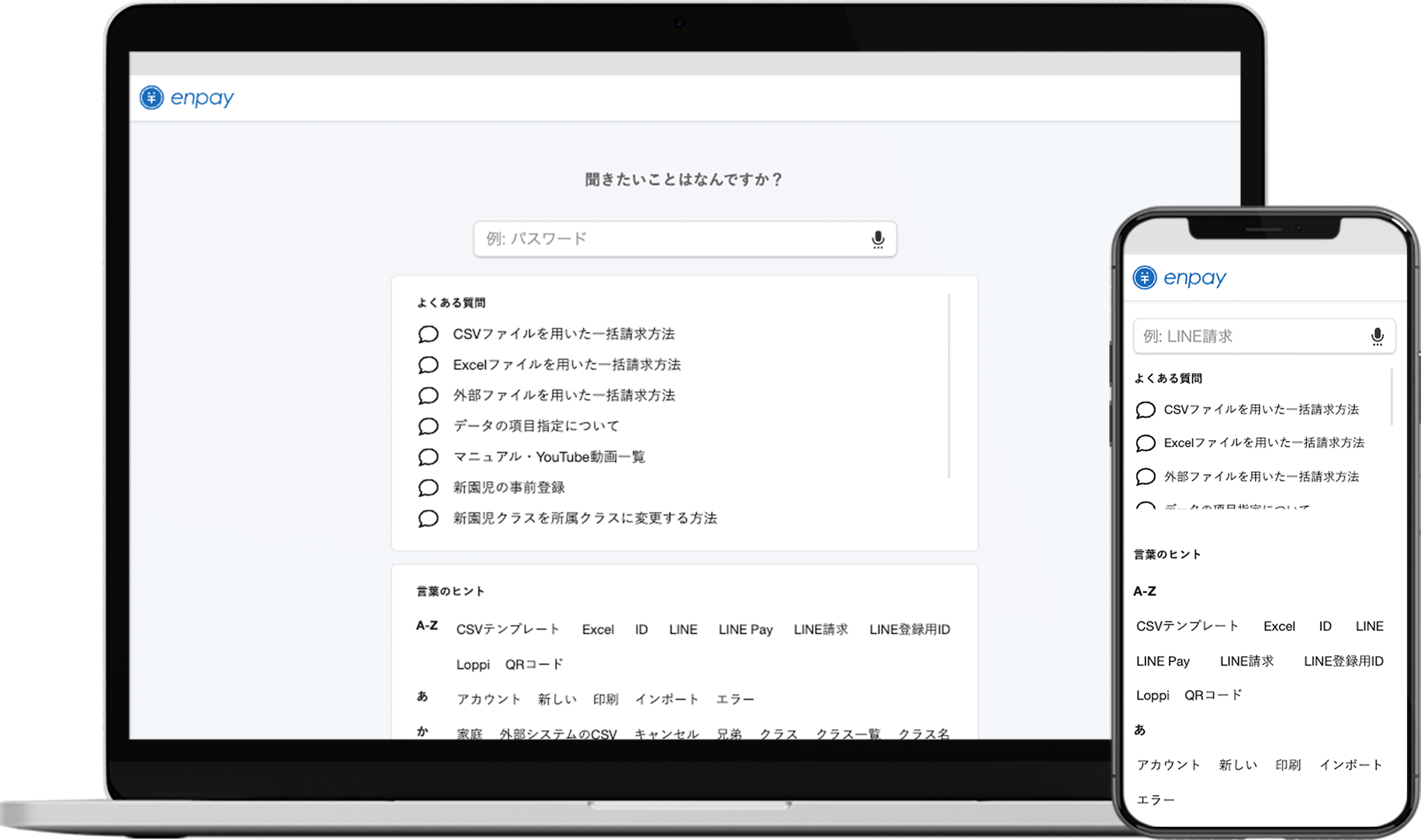 「enpay(エンペイ)」はパソコンとスマートフォンを活用し、現金や紙を一切やり取りすることなく、請求から支払いまで完結することができる集金支援サービスです。これまで、「請求書/明細作成」→「集金」 → 「未納者への督促/再請求」 → 「集計」 → 「領収書発行」 → 「集金管理/銀行入金」 → 「会計データ作成/月次締め作業」と手間のかかっていた集金業務を、DX化・キャッシュレス化・ペーパーレス化することによって劇的に業務効率化することができ、保育園・こども園・幼稚園・学校・塾・習い事教室を中心に、全国でサービスが拡大しています。