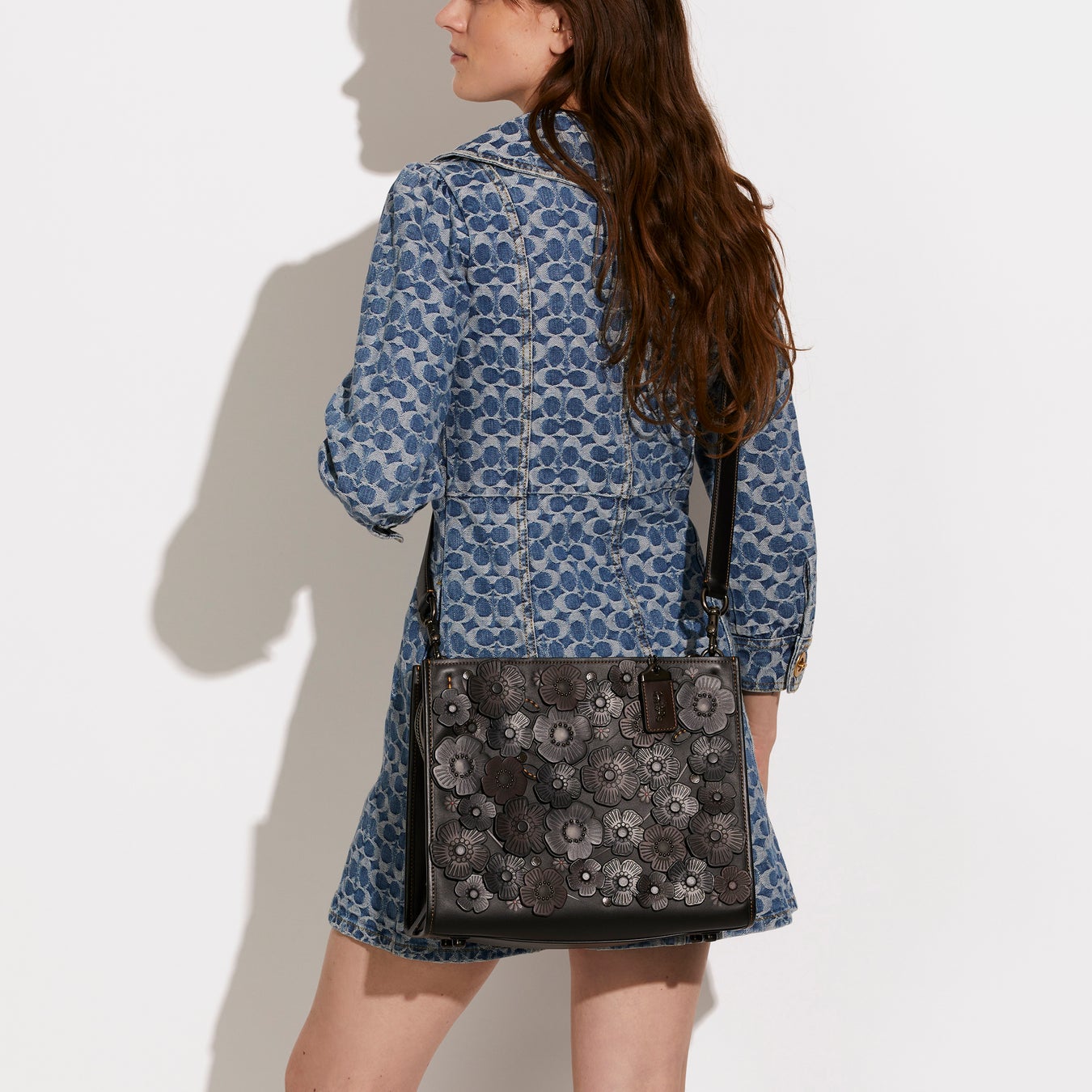 自由な精神、反骨心、夢多き若者にインスパイアされ名づけられ、2016年の誕生以来デザイン性と機能性を併せ持ちコーチの “it”バッグ として愛され続けている “Rogue (ローグ)” 。2022年春の新作は、コーチの人気アイコンモチーフである “ティーローズ” を贅沢にあしらったデザインを、数シーズンぶりに爽やかなカラーにアップデートしました。エンボス加工とスクリーンプリントを施したレザーを花の形に打ち抜き、クラフトマンの手によって一枚ずつ丁寧にセットされたティーローズ。リベットを足すことでさらに立体感を与え、絶妙なグラデーションを帯びたティーローズにリッチな質感を生み出しています。