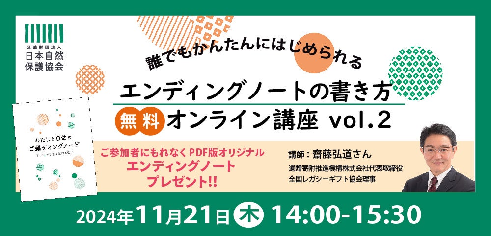 公益財団法人日本自然保護協会(理事長:土屋俊幸)では2024年11月21日(木)に、「誰でもかんたんにはじめられる エンディングノートの書き方オンライン講座 vol.2」を開催します。
