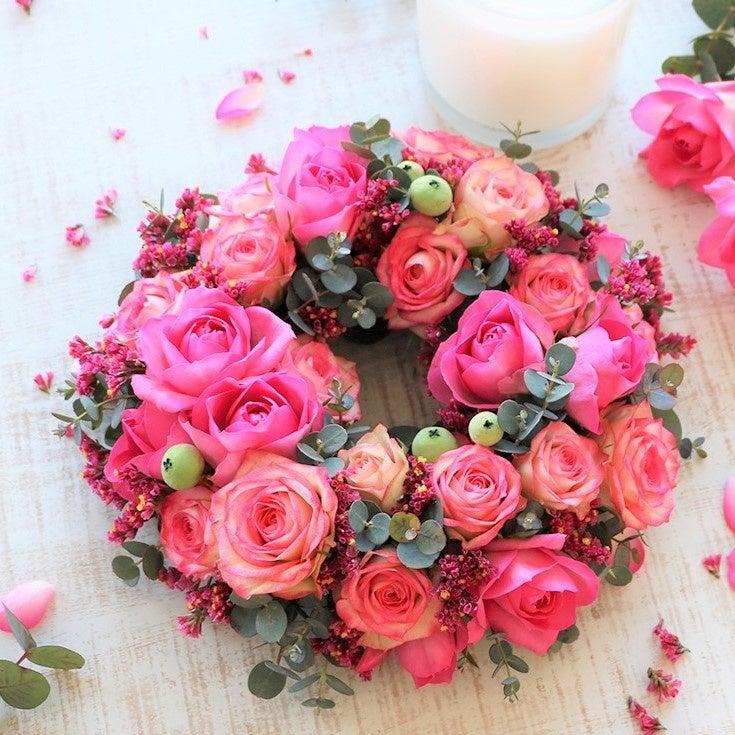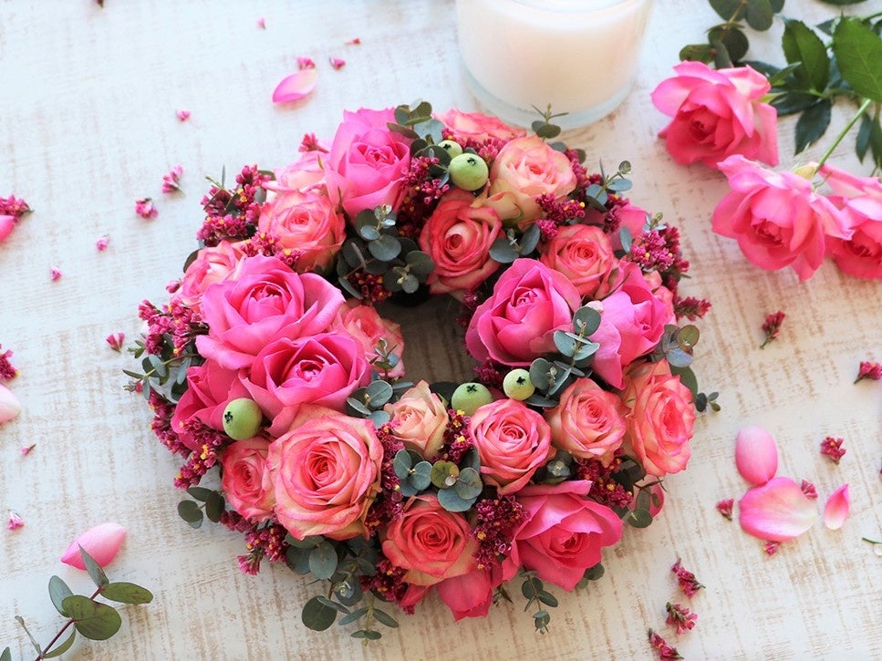 5周年を記念し、バラを贅沢にあしらったリース型アレンジメントを作る特別ワークショップを開催します。