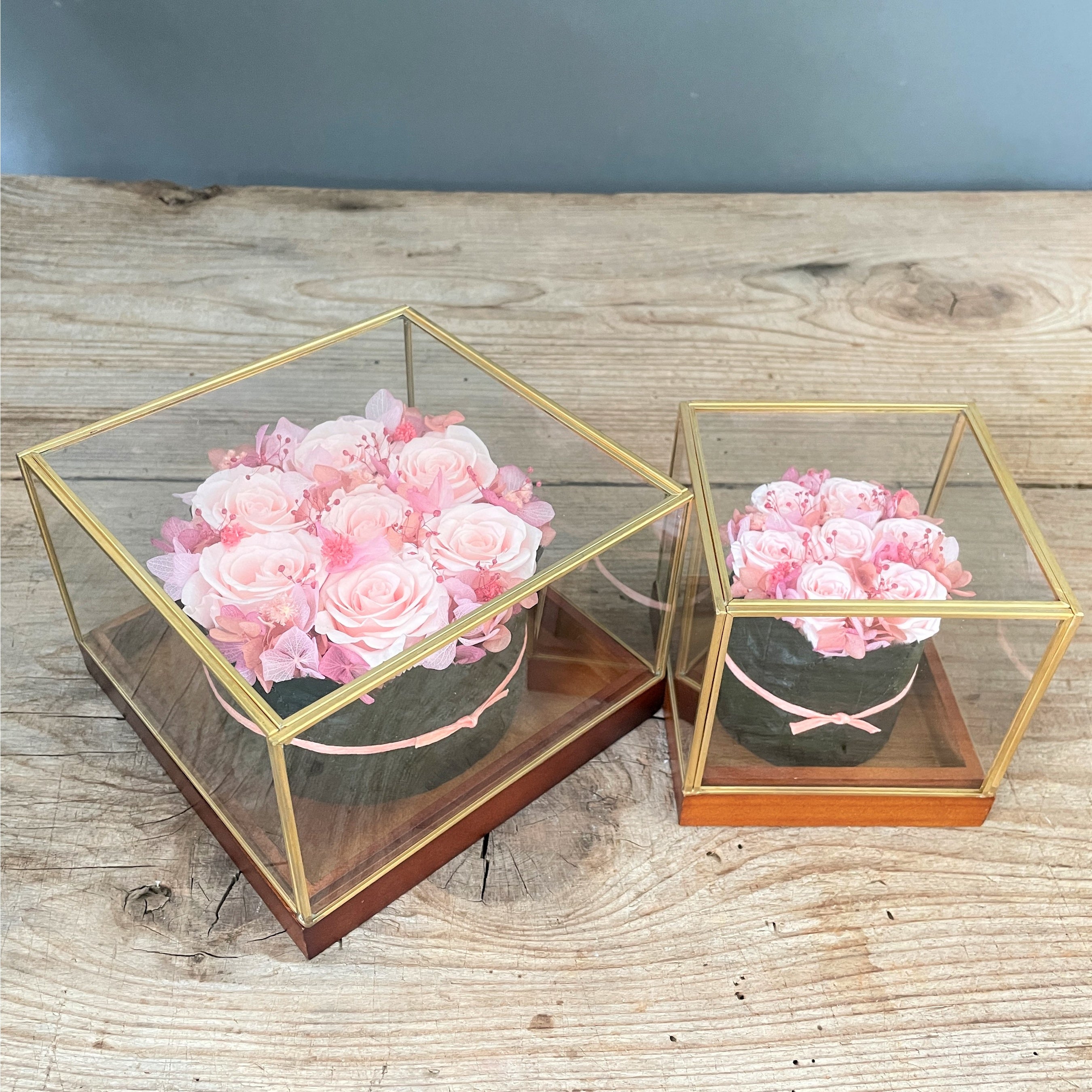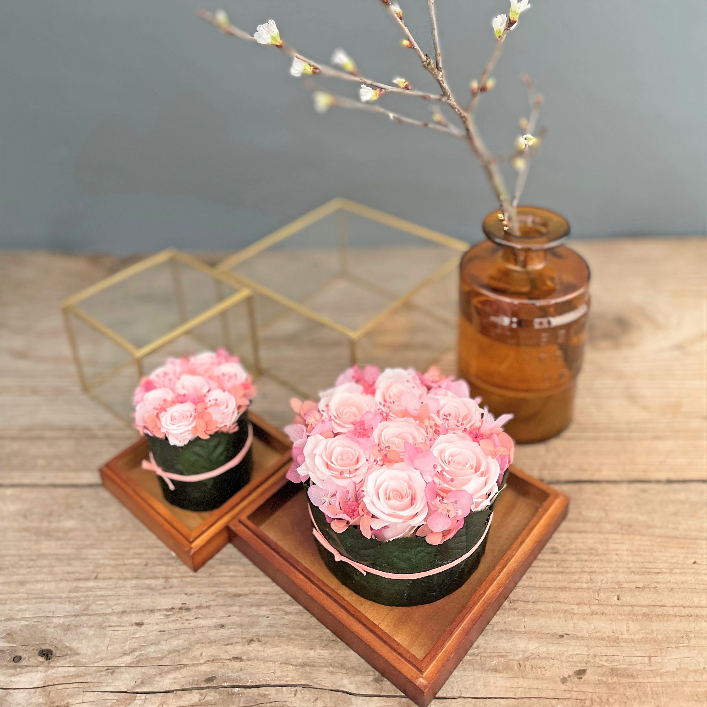バラを敷き詰めたタルトのような大人気のアレンジメント。5周年を記念した桜色の限定カラーをご用意しました。