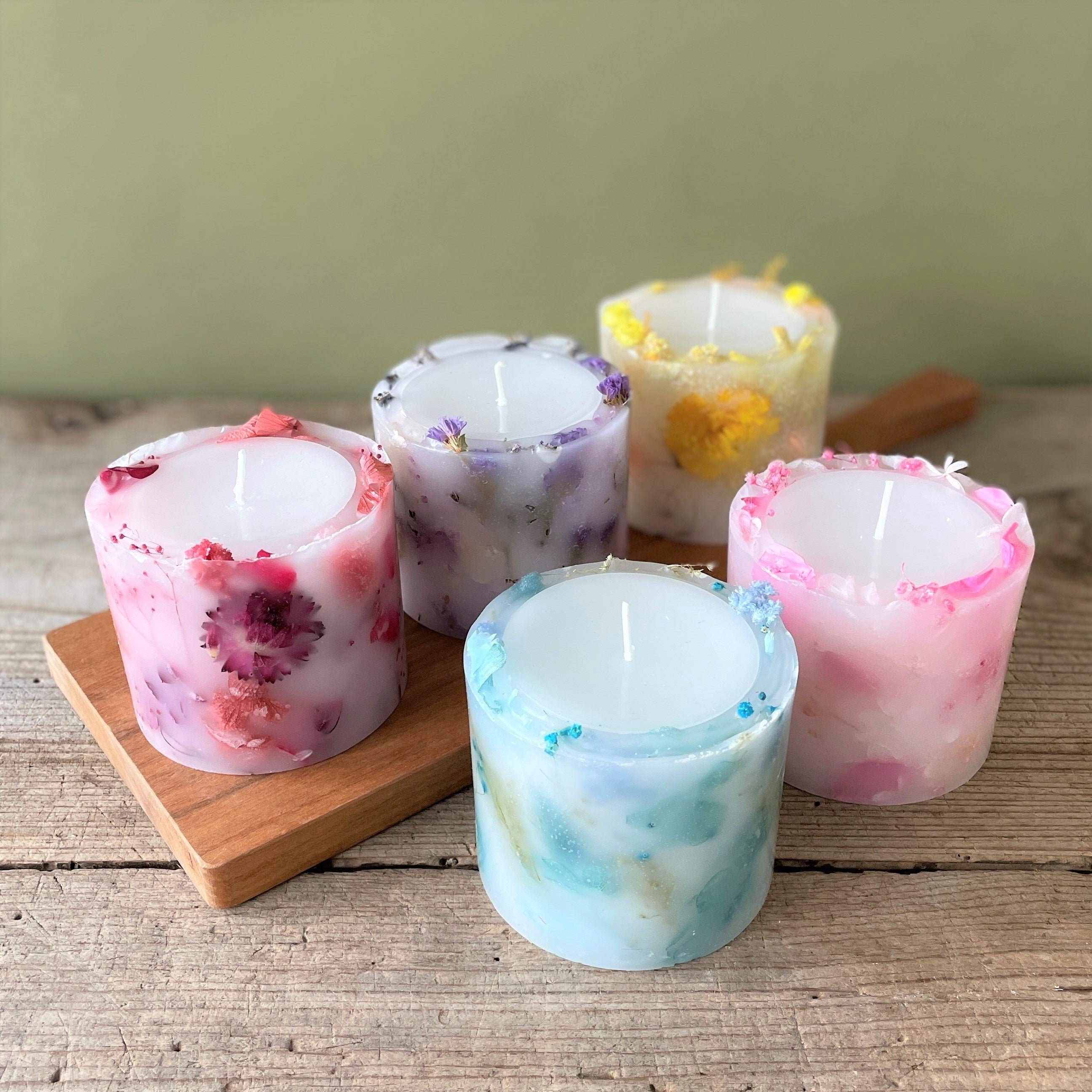 桜・シトロネラ・ローズ・フリージア・ラベンダーの5つの色と香りのアロマキャンドルを限定販売。スタッフが手作りしたビアンカバーネット日比谷店オリジナルアロマキャンドルです。