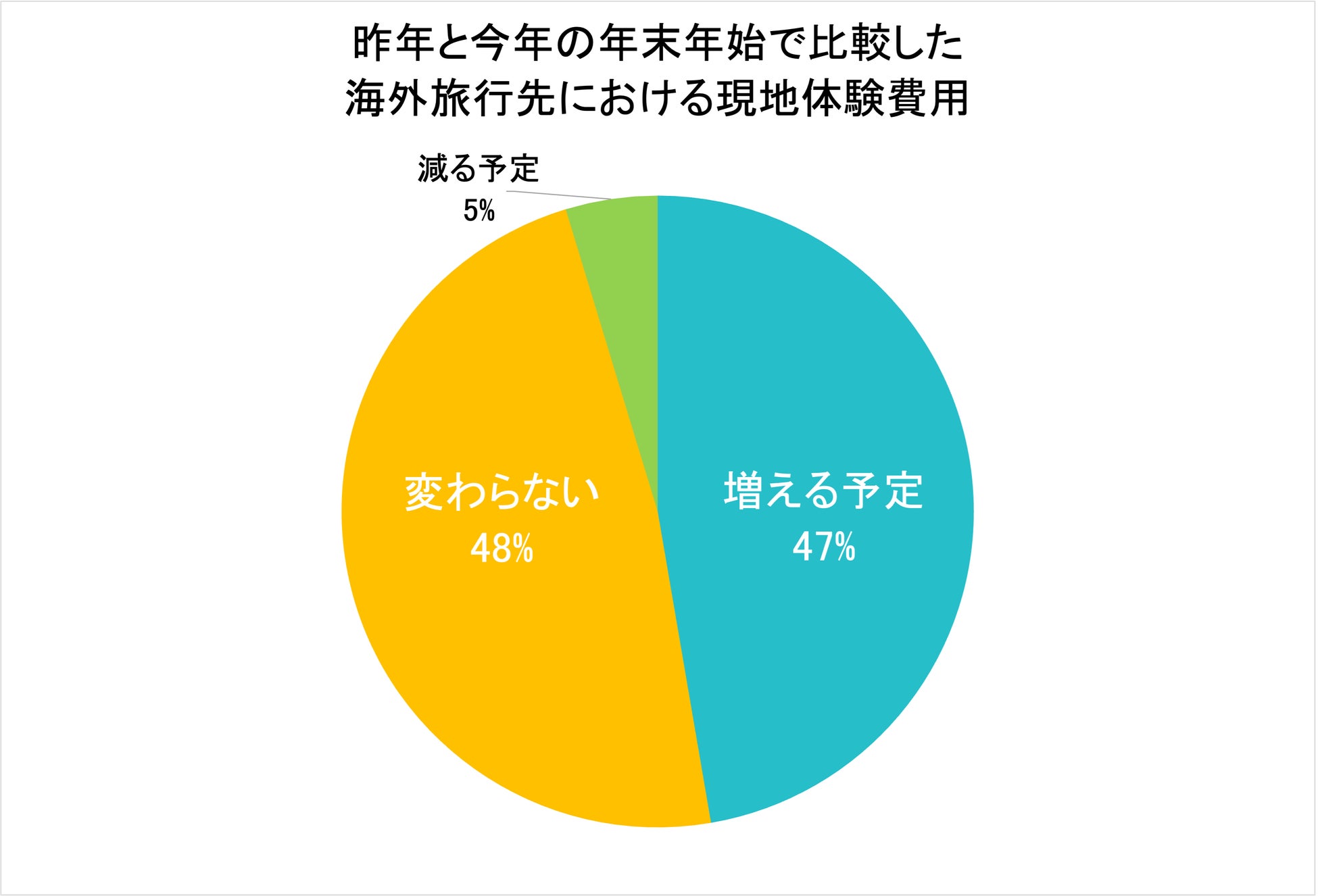 また、昨年の年末年始と比べて、現地体験に使う費用がどう変化したかを尋ねると、「増えた」が47.3%、「変わらない」が48%、「減る」が4.7%となりました。