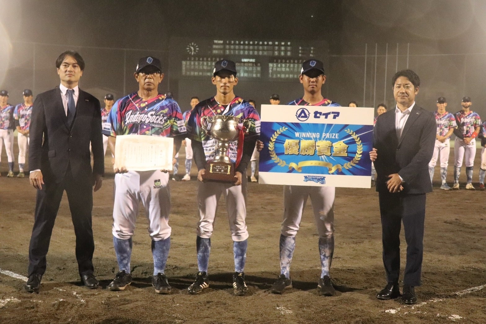 「トリドール杯 チャンピオンシップ」とは、四国アイランドリーグplusの前期・後期それぞれのシリーズの優勝球団間で、年間総合優勝を決める公式戦です。年間総合優勝チームの徳島インディゴソックスには、当社サステナビリティ推進部長の大下から優勝カップを贈呈させていただきました。