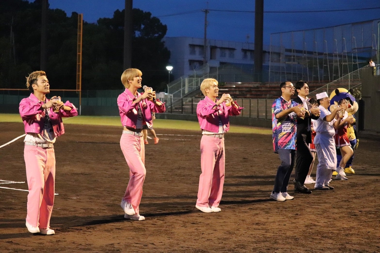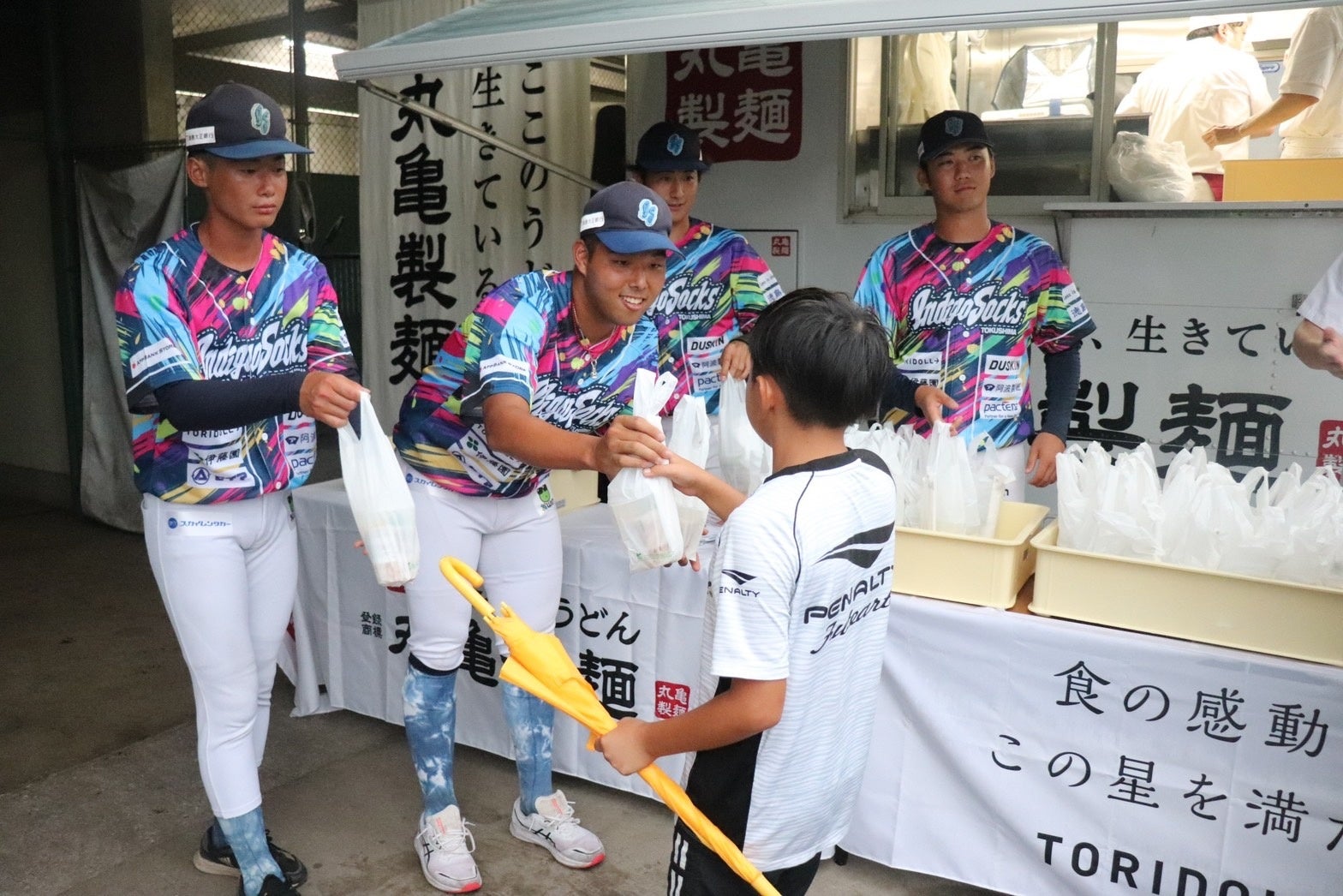 試合前には、讃岐うどん専門店「丸亀製麺」のテイクアウト商品「丸亀シェイクうどん」秋の新商品『凍らせレモンのおろしぶっかけうどん』を来場者先着300名様にプレゼントしました。さらに、オープニングセレモニーとして「丸亀シェイクうどん」のTVCMに特別出演し、CMでお馴染みの「シェイクうどんダンス」を考案したパワーパフボーイズが来場者と一緒に「シェイクうどんダンス」を踊るなど、試合前の会場を大いに盛り上げていただきました。