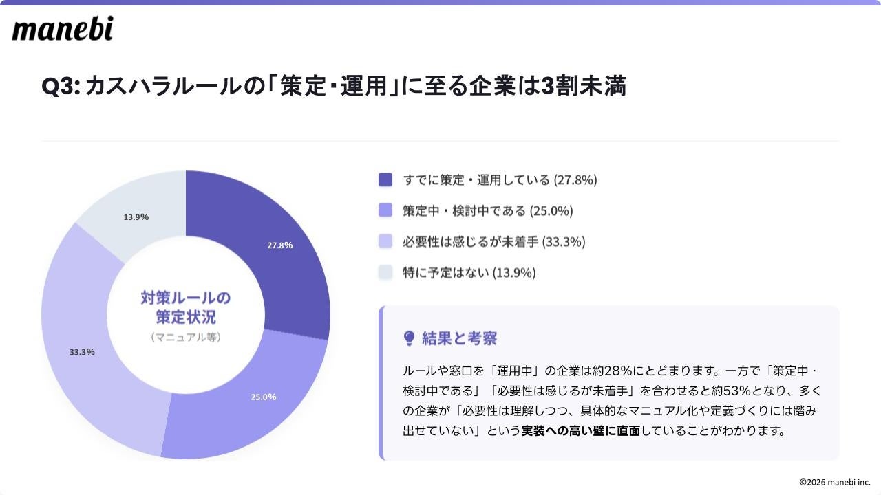 対応マニュアルや相談窓口の設置などの「ルール策定」を行っているか尋ねたところ、「すでに策定・運用している(27.8%)」企業は3割未満にとどまりました。