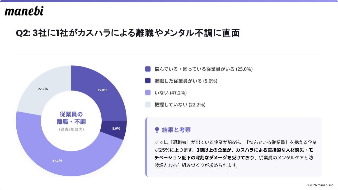 株式会社manebi(本社:東京都新宿区、代表取締役執行役員CEO:田島 智也)は、企業の人事・総務担当者等を対象に「カスタマーハラスメントに関する実態調査」を実施いたしました。
