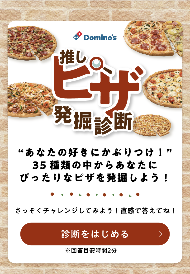 株式会社ドミノ・ピザ ジャパン(代表取締役:ジョシュア・キリムニック、本社:東京都千代田区、以下:ドミノ・ピザ)が展開する国内No.1シェアを誇る宅配ピザチェーン ドミノ・ピザは、性格診断をもとに、35種類の中から自分にぴったりなピザが診断できる「推しピザ発掘診断」の提供を2022年6月13日(月)より開始します。合わせて、「推しピザ発掘診断」の結果をSNSに投稿すると「ピザ無料券」が当たるキャンペーンを同日より開催します。