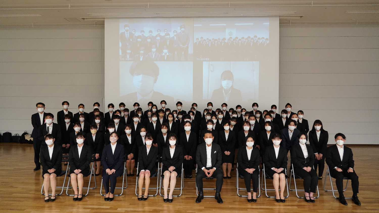 入社式では、当社代表 田村が新入社員への期待を祝辞として述べたあと、新入社員全員が事前に「自分を表す言葉」をテーマに撮影した動画で自己紹介を行いました。また、新卒先輩社員から新入社員に向けて動画でエールを送りました。