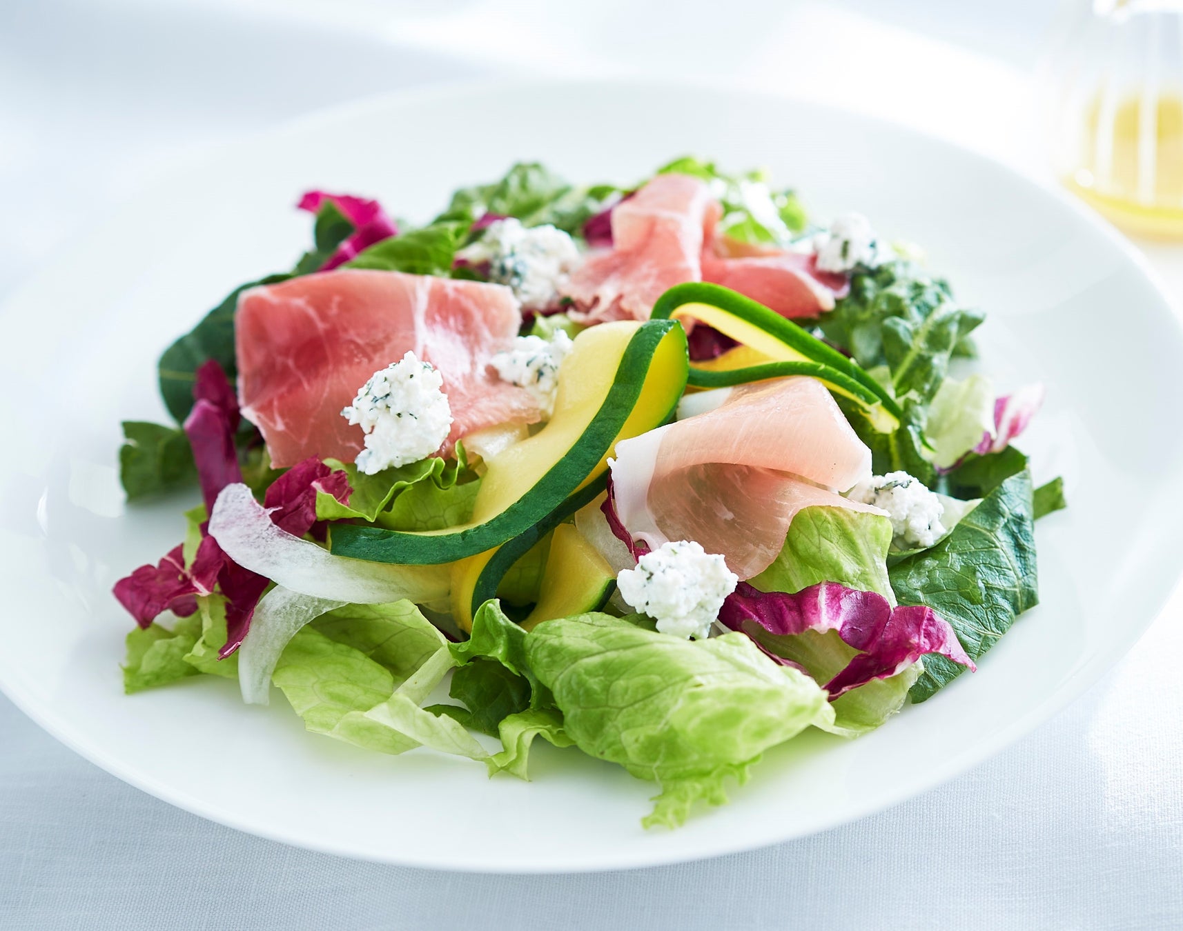 特徴的なリボン状にカットしたズッキーニと、しっとりとした口当たりで程よい塩味と旨みを感じる北海道産生ハムの組み合わせ。ズッキーニはボイルすることで食感も良く色味も鮮やかに。2種類のマスタードを使った白ワインビネガーのドレッシングが、生ハム・ズッキーニと好相性です。