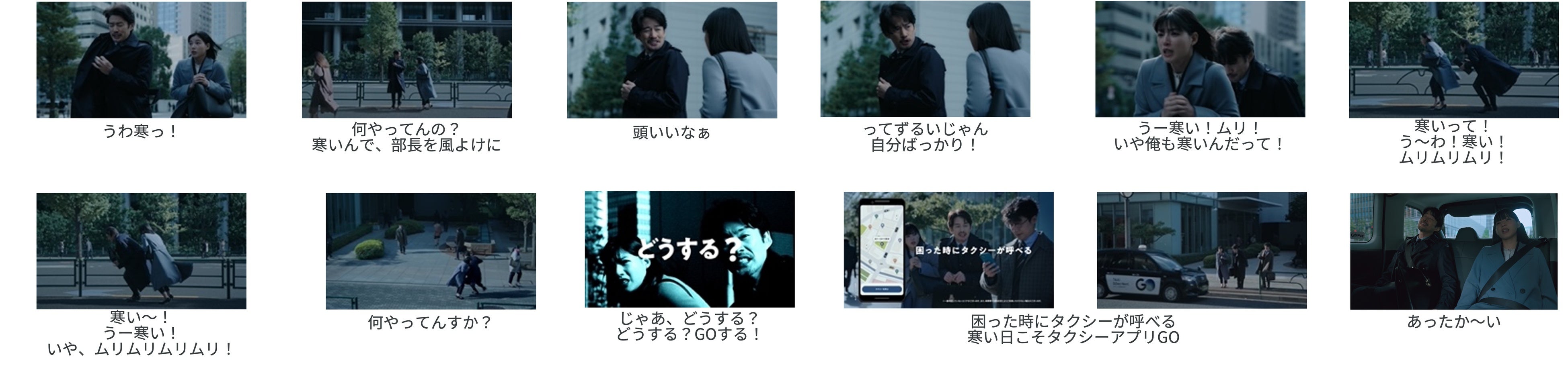 竹野内 豊さん演じる剛田部長と、前原 滉さん演じるしっかり者の後輩が出演する「どうする?GOする!」TVCMシリーズは2021年6月にスタート、2022年からは新たに後輩役として石井 杏奈さんが加わりました。少し天然な剛田部長と後輩たちのチャーミングなやりとりを描く本シリーズは、多くの方より好評いただいています。今回新たに公開となる「GOする!寒い日」篇は、北風が吹きすさぶ街中での出来事を描いています。前を歩く人を風避けにするという、誰しもが体験したことがあると思われる防寒対策を、街中で剛田部長と石井さんが大人げなくやり合っているところに、前原さんが『GO』でタクシーを呼び解決するというストーリーです。毎度お馴染みの剛田部長の「どうする?」の投げかけに石井さんも加わり、極寒の屋外からタクシーに乗って幸せを感じる二人のホッとした表情は必見です。