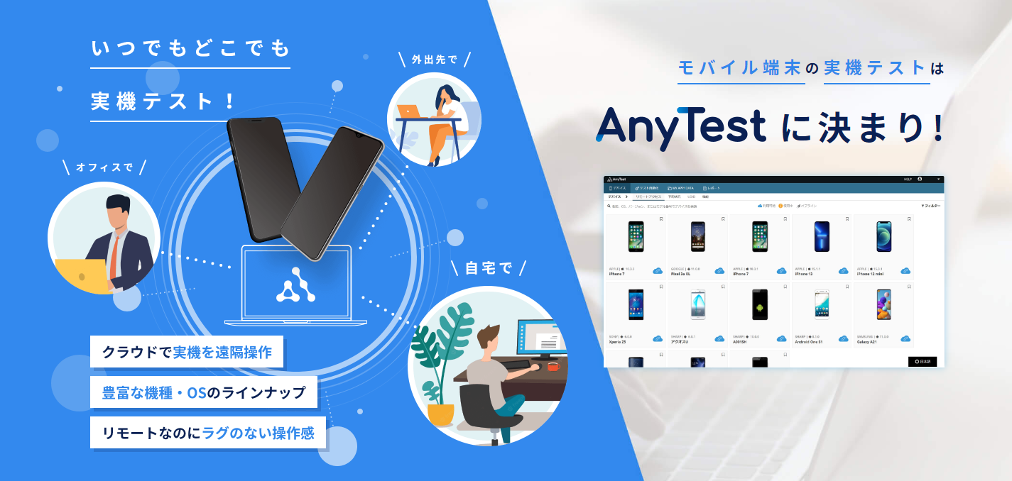 AnyTestは、手元に端末がなくても、いつでもどこでも実機で検証・テストが可能になります。