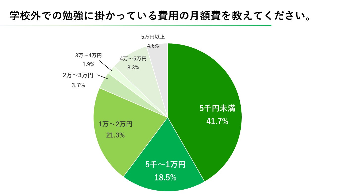 学校外での勉強に関しては「学習塾・公文」が最も多く4割弱が通っているという結果に。「参考書やワーク」による自主学習が2位、「学童」が3位の結果になりました。これらに関する月額費用は五千円未満が最も多く41.7%、次いで1万~2万円が21.3%という結果になりました。
