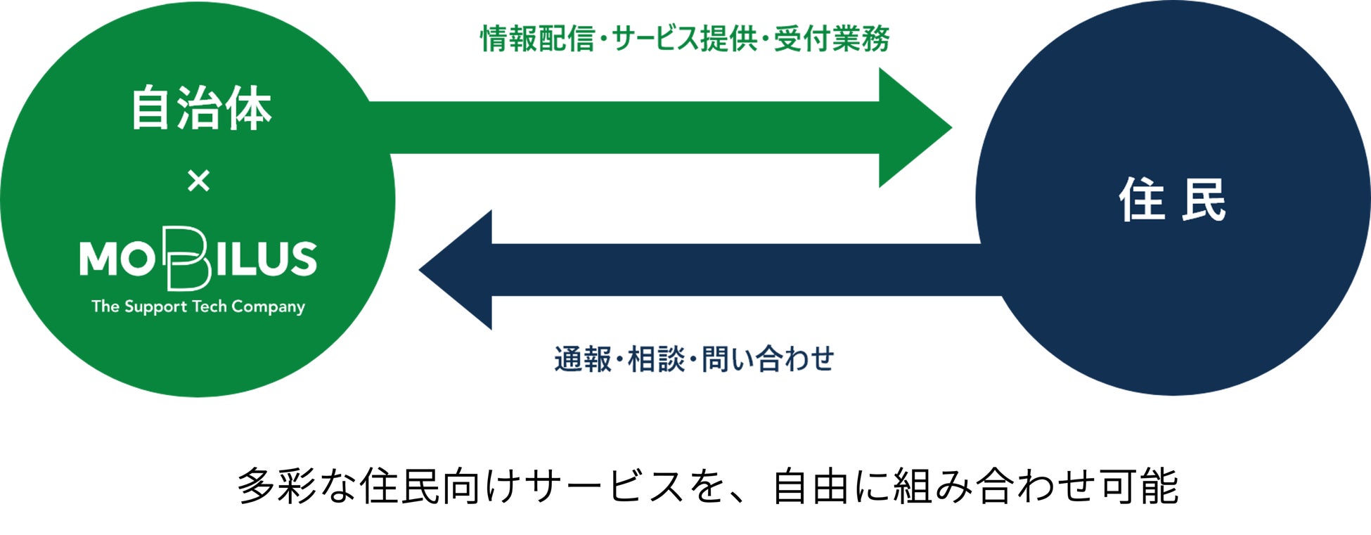 「Mobilus 自治体ソリューション」は、自治体ごとの異なるニーズに応じ、必要なオプションを選び、最適な住民向けサービスが構築できます。市民広報の強化にはLINEによる情報配信、住民コミュニケーションの強化にはチャット対応など柔軟なサービス設計が可能です。