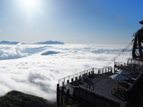 標高1,770mの竜王マウンテンリゾート山頂エリアは真夏でも20℃をほとんど超えることが無い絶景の避暑地となります。エリア内の「SORA terrace」からは、条件が合えば雲海やサンセットを眺めることができ、非日常空間を体験する事ができます。雲海は早朝に発生するイメージがありますが、夕方に雲海が発生する確率が最も高く、目の前の北アルプスに沈むオレンジ色に色づく夕日に照らされた雲海が見られるスポットとなります。