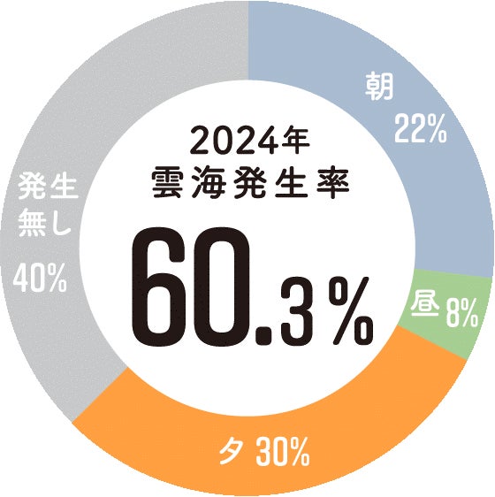 雲海が発生しやすい条件としては、日中との気温差のある朝や夕方の時間帯の他にも、夕立などの急な雨が降った後(翌朝)でも多く発生しており、2024年のグリーンシーズンは60.3%の確率※4で雲海が発生しております。