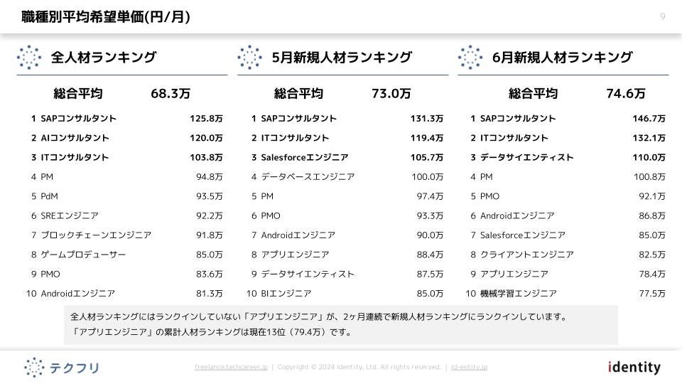 ITフリーランスエンジニアの案件・求人サイト「テクフリ」(https://freelance.techcareer.jp/)を運営する株式会社アイデンティティー(東京都新宿区、代表取締役:今野力、以下「当社」)は、テクフリのデータベースをもとに2024年6月における人材の市況感を調査しました。より詳しい結果については、お問い合わせから資料請求が可能です。