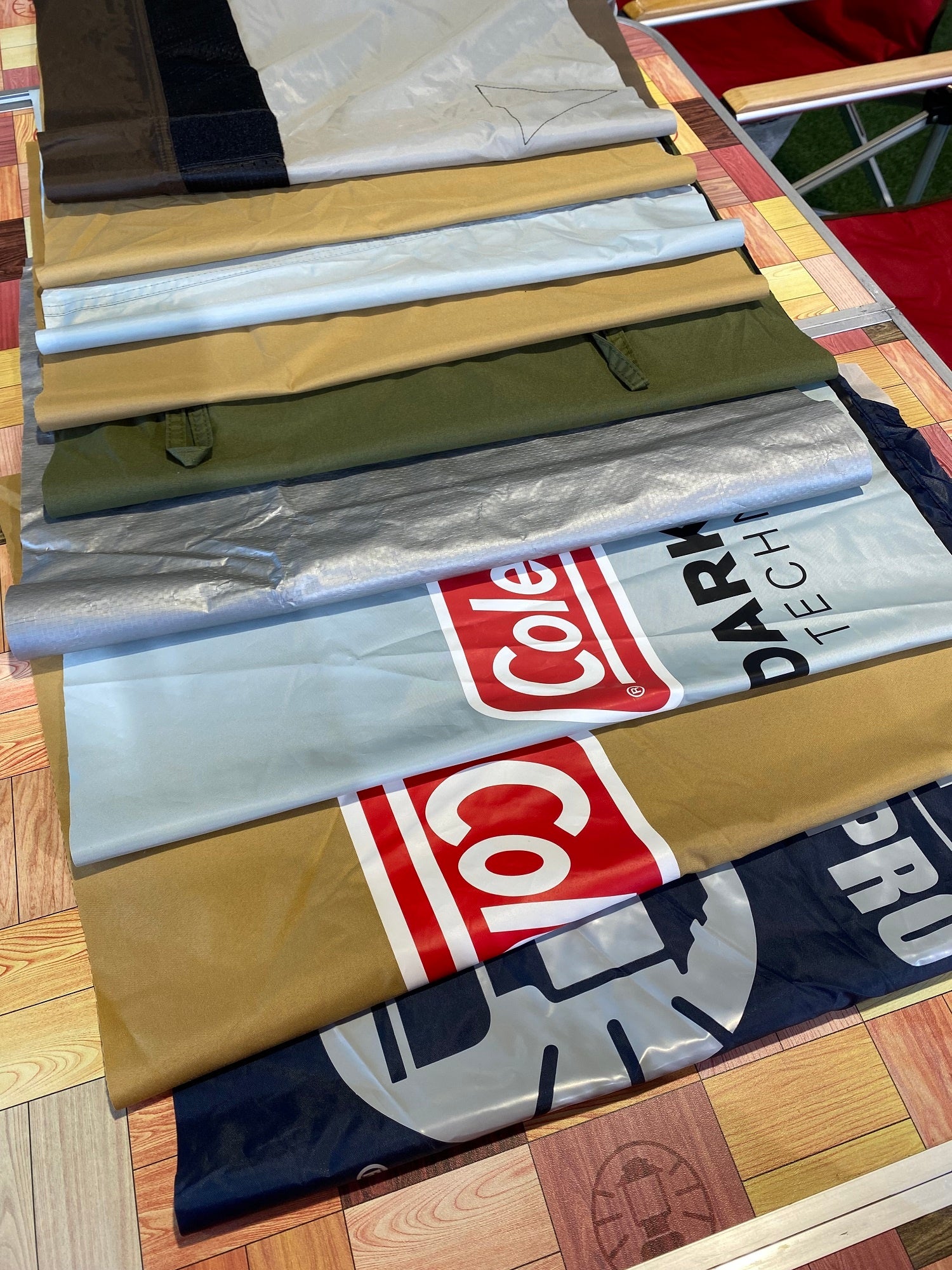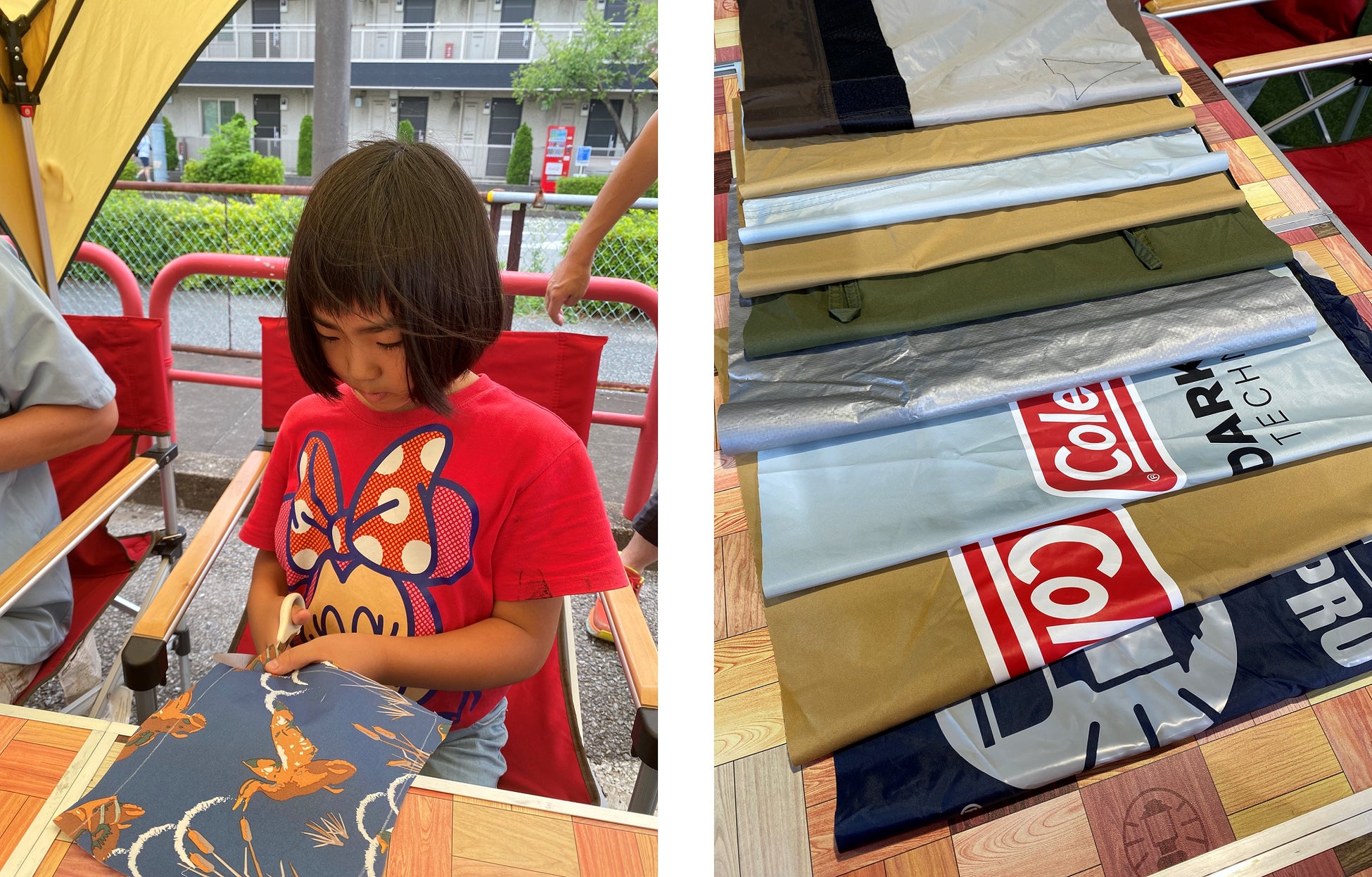 ※廃棄になる製品を無駄なく裁断し、ワークショップ等に活用しています。ワークショップで使用する生地は、コールマン・ロゴが入っているものは数枚のご用意になりますので、ご理解の上ご参加くださいますようお願いいたします。