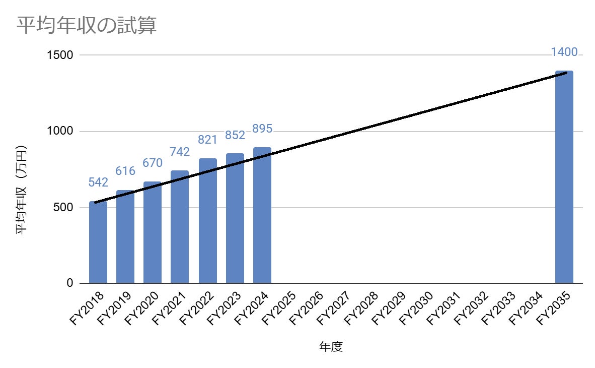 弊社試算の昇給を継続することができれば、入社新入社員比率※1、退職率、退職者平均年収が現在と同水準とした場合、2035年には平均年収が1400万円台になることが見込まれます。トヨクモは、この水準を一つの目安として、中長期的に人材採用競争力の向上に取り組んでまいります。