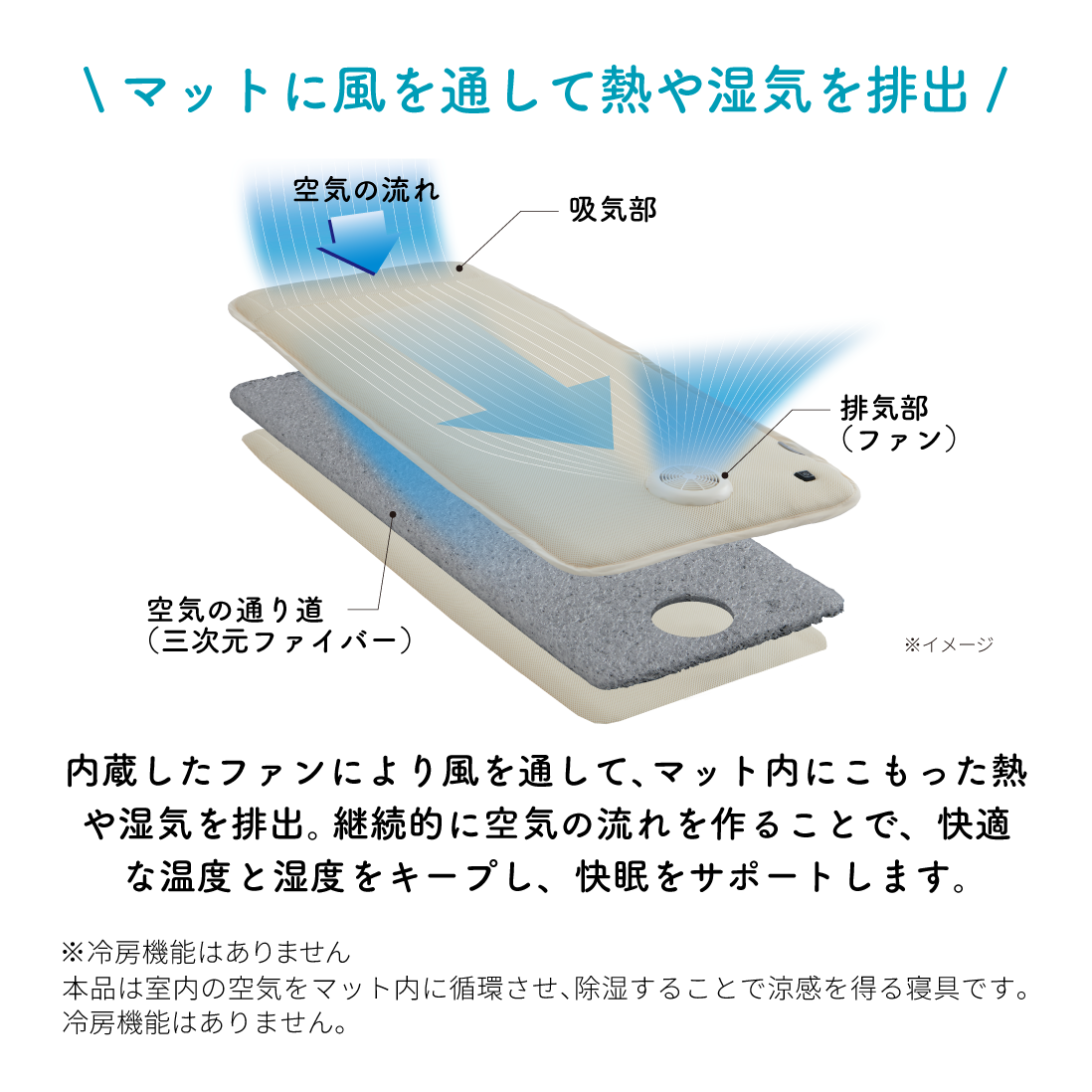 暑い季節は寝汗によるジメジメした寝具の不快さから睡眠の環境が低下しがちです。本製品はマット内に空気の通り道を作り、ファンによってマット内部にこもった熱や湿気を排出し、蒸れを抑えます。継続的に空気の流れを作ることで、快適な温度と湿気をキープします。シリーズの中でも最もコンパクトなサイズで、持ち運びやしやすく手軽に使えます。