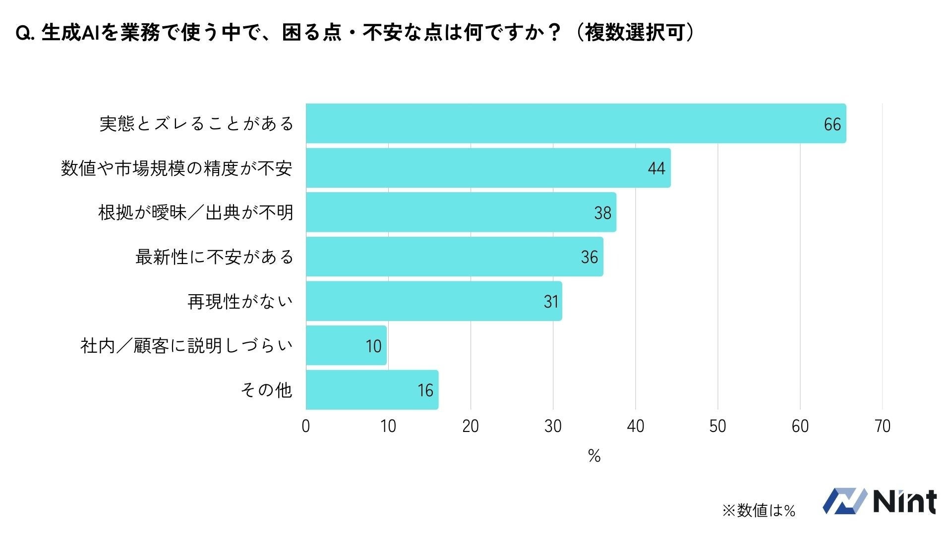 一方で、約7割が「実態とズレることがある」、約5割が「数値・市場規模の精度」に不安を感じていることが判明